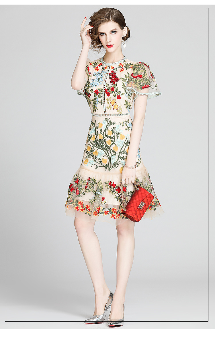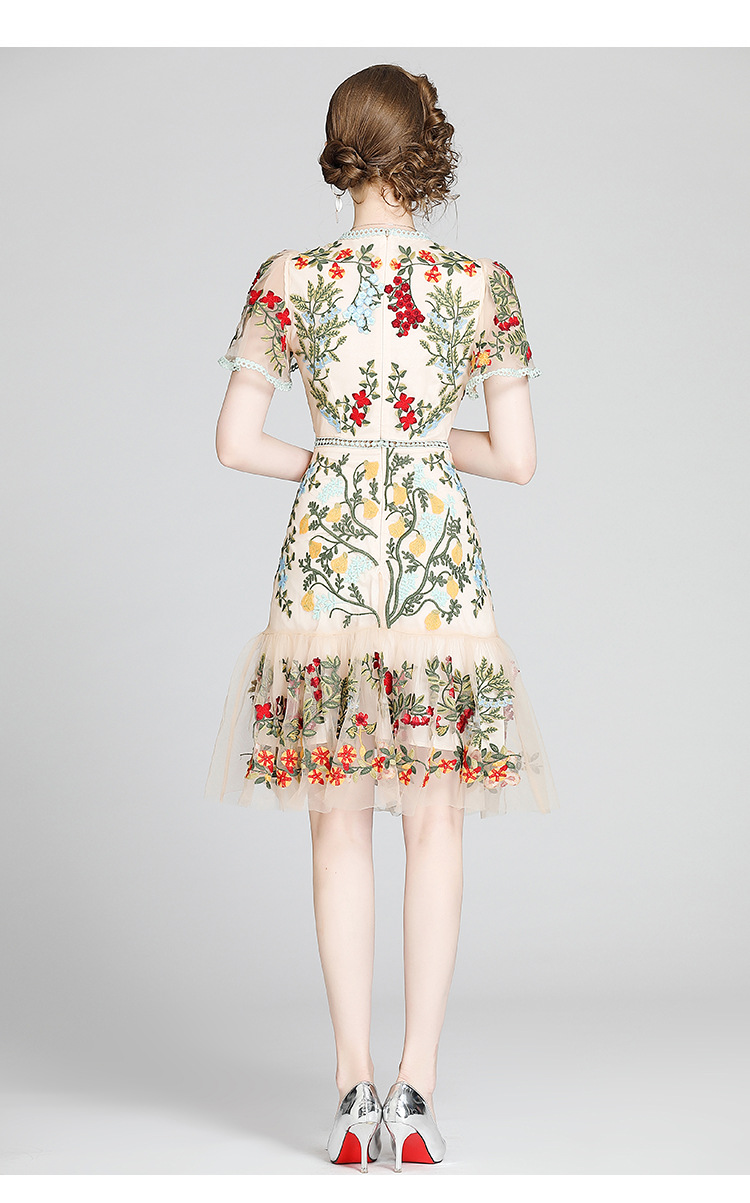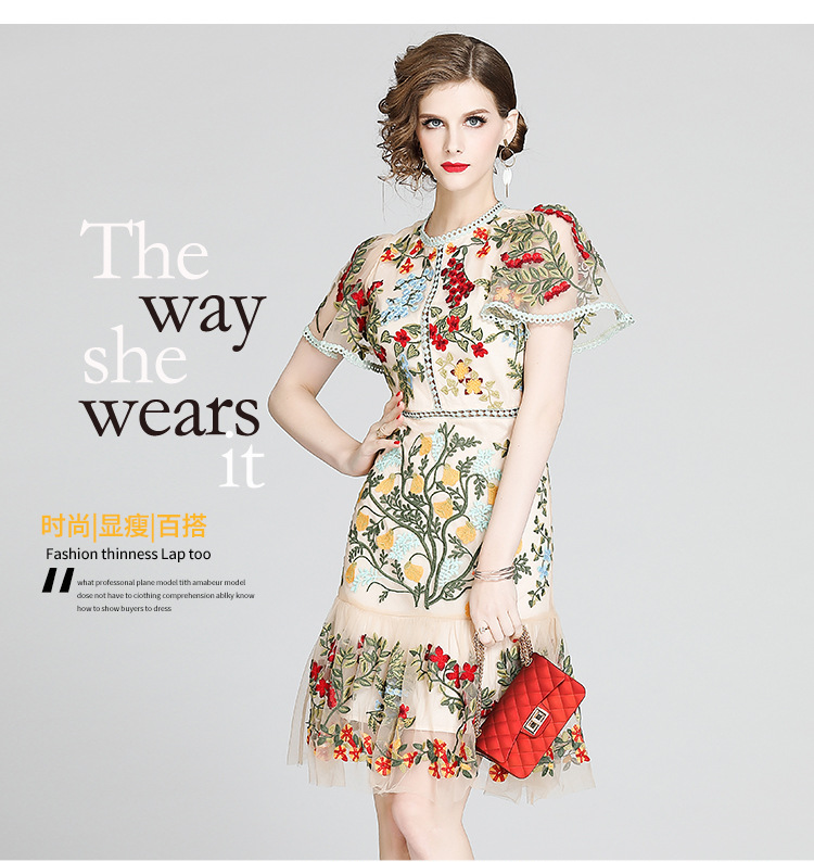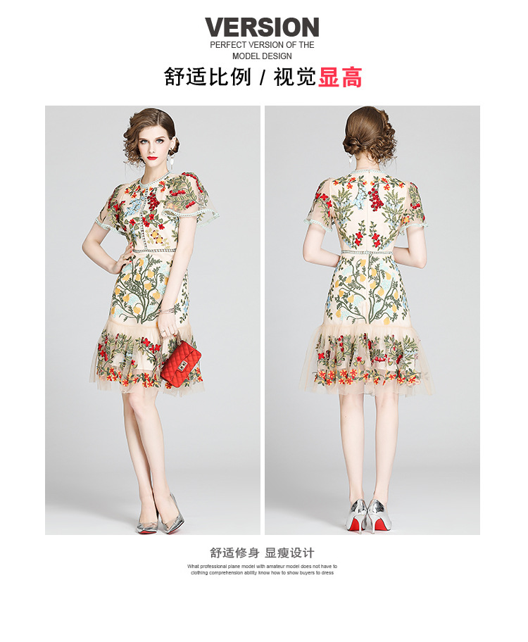 欧米の婦人服2023夏服の新型の水溶レースの半袖の網の紗の刺繍は腰を収めて尻のハスの葉の縁のワンピースを包みます。