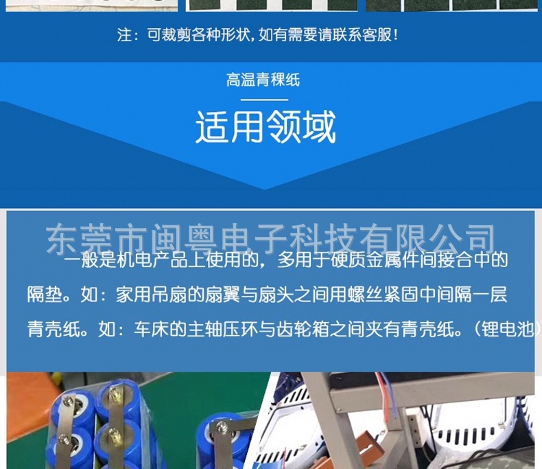 应用范围:一般是机电产品上使用的。多用于硬质金属件间接合中的隔垫。如家用吊扇的扇翼与扇头之间用螺丝紧固中间隔一层青壳纸。车床的主轴压环与齿轮箱之间夹有青壳纸。