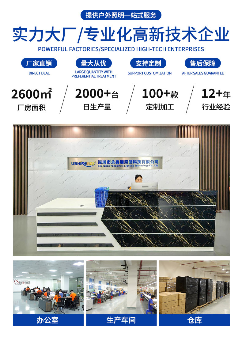 製品は広く使用されています:橋と桟橋、高速道路トンネル、広告看板、庭園の風景、都市照明、工場作業場、倉庫スーパーマーケットなど。