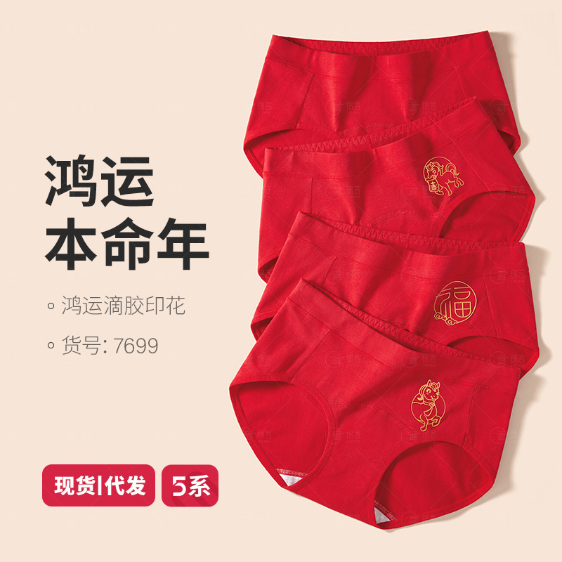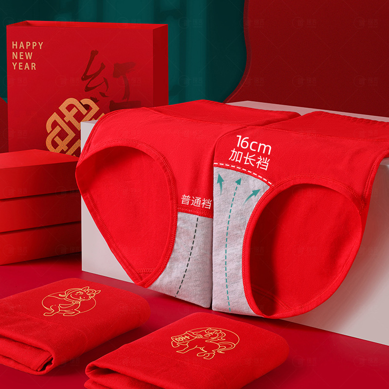 新作100%綿ロング丈中腰レッドショーツ女性用干支馬年赤色結婚純綿三角パンツ