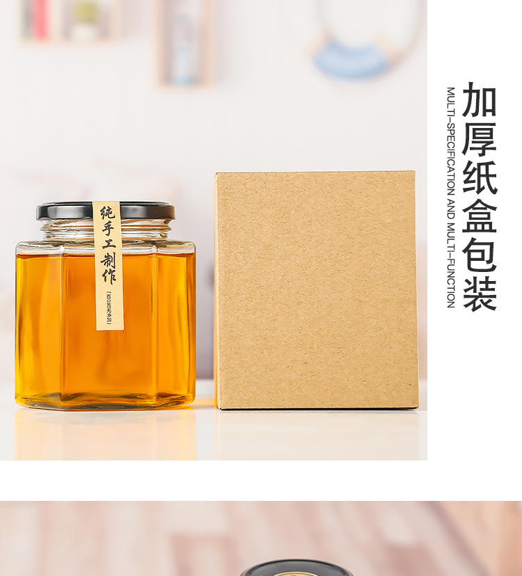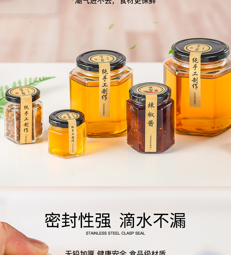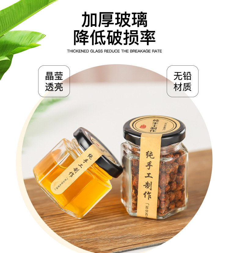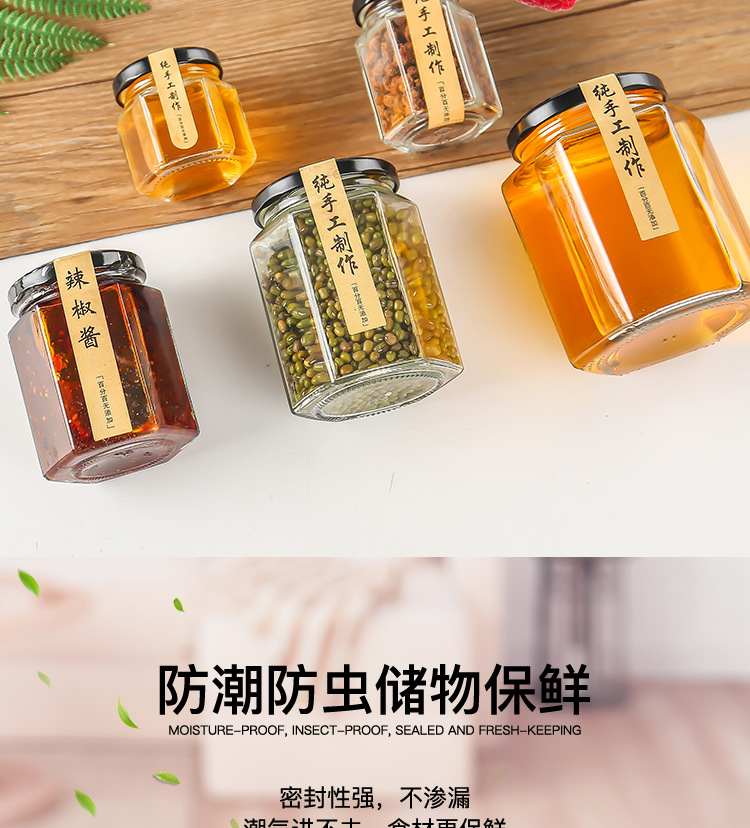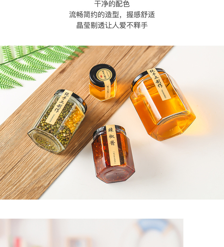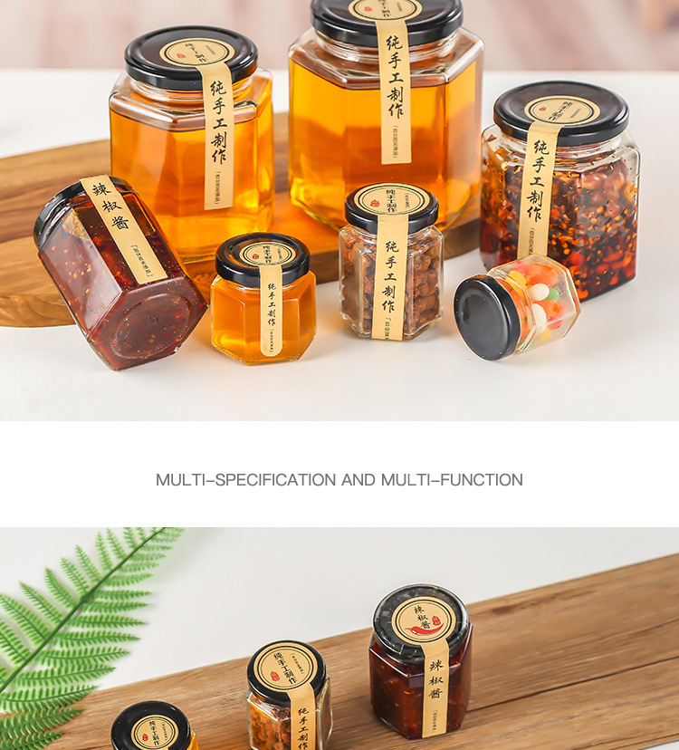メーカー卸売り380mlガラス六稜蜂蜜瓶透明味噌汁瓶密封ジャム瓶500グラム蜂蜜瓶