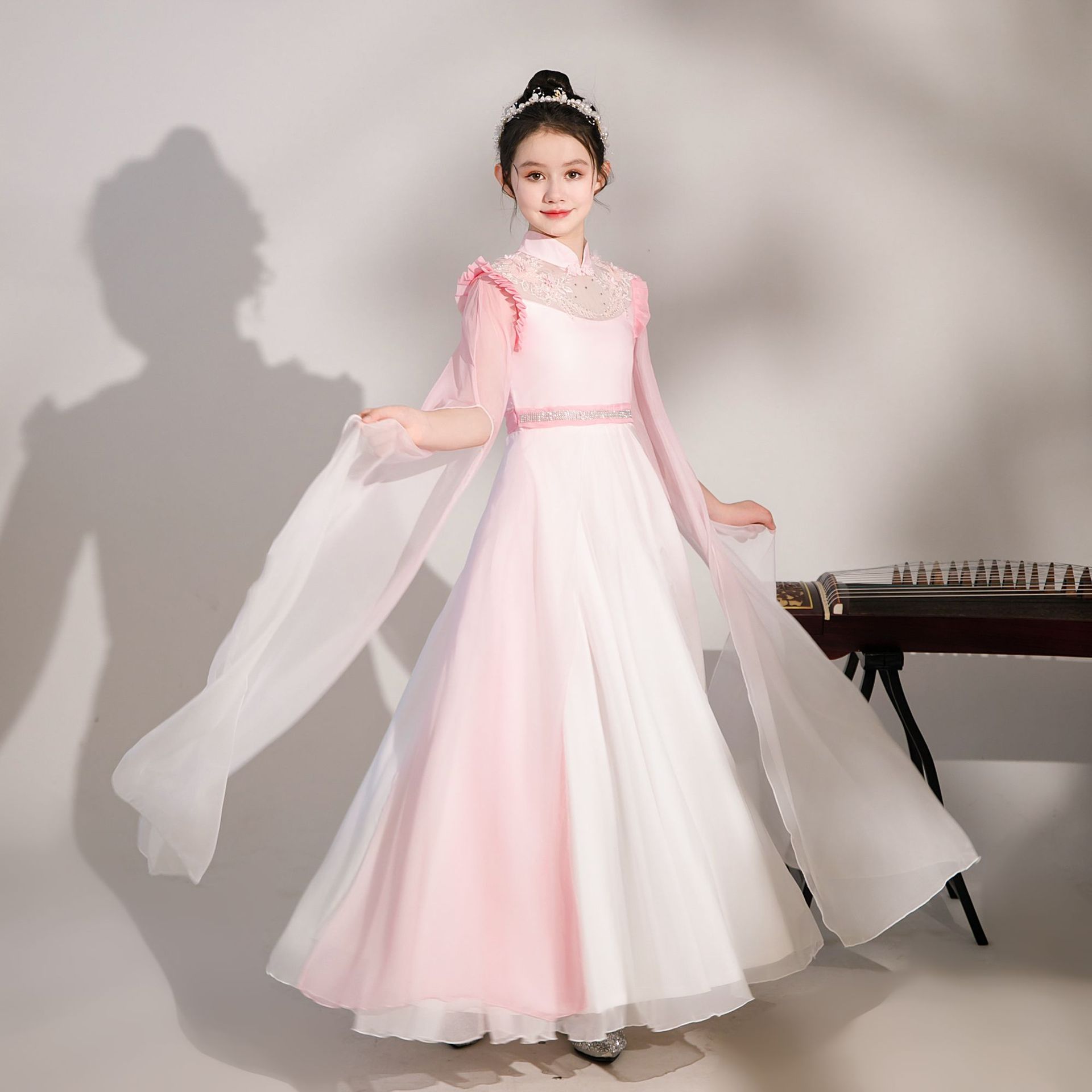 シャンパンゴールド子供用古筝演奏服2026新作中国風超妖精少女民族楽演奏服古筝服