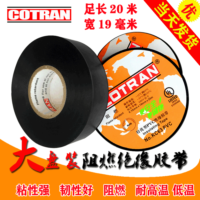 電気技師絶縁テープcotran科創kc63大巻20メートル黒色難燃防水耐高温高接着テープ