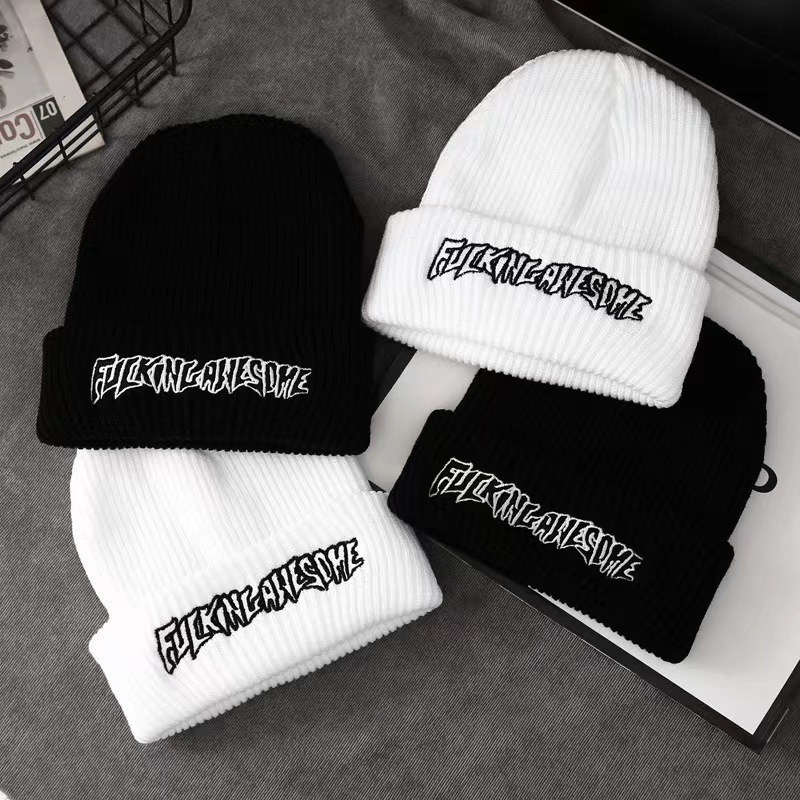 秋冬の薄いニット帽男女韓国版刺繍毛糸冷帽学生が買い物をしています。