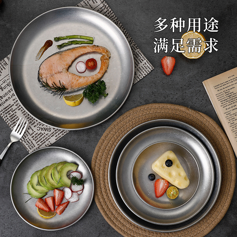 ステンレスのレトロな皿の韓国式のアイデアの洋食のデザートの果物のお菓子の復古風は古い雪の花の焼肉の円盤をします。