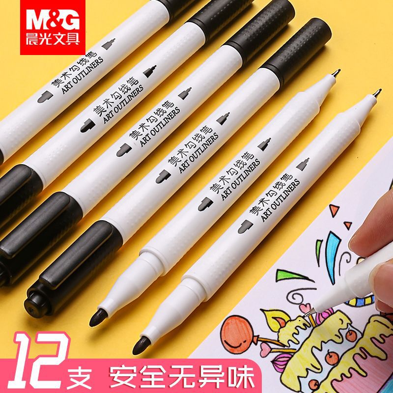 晨光考试勾线笔ACP95890双头记号笔黑色学生描边美术线描笔绘画