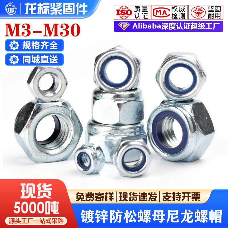 緩み止めナット、ナイロン製滑り止め六角ナット、亜鉛メッキネジナット、M3M4M5M6、新エネルギー対応ネジ山