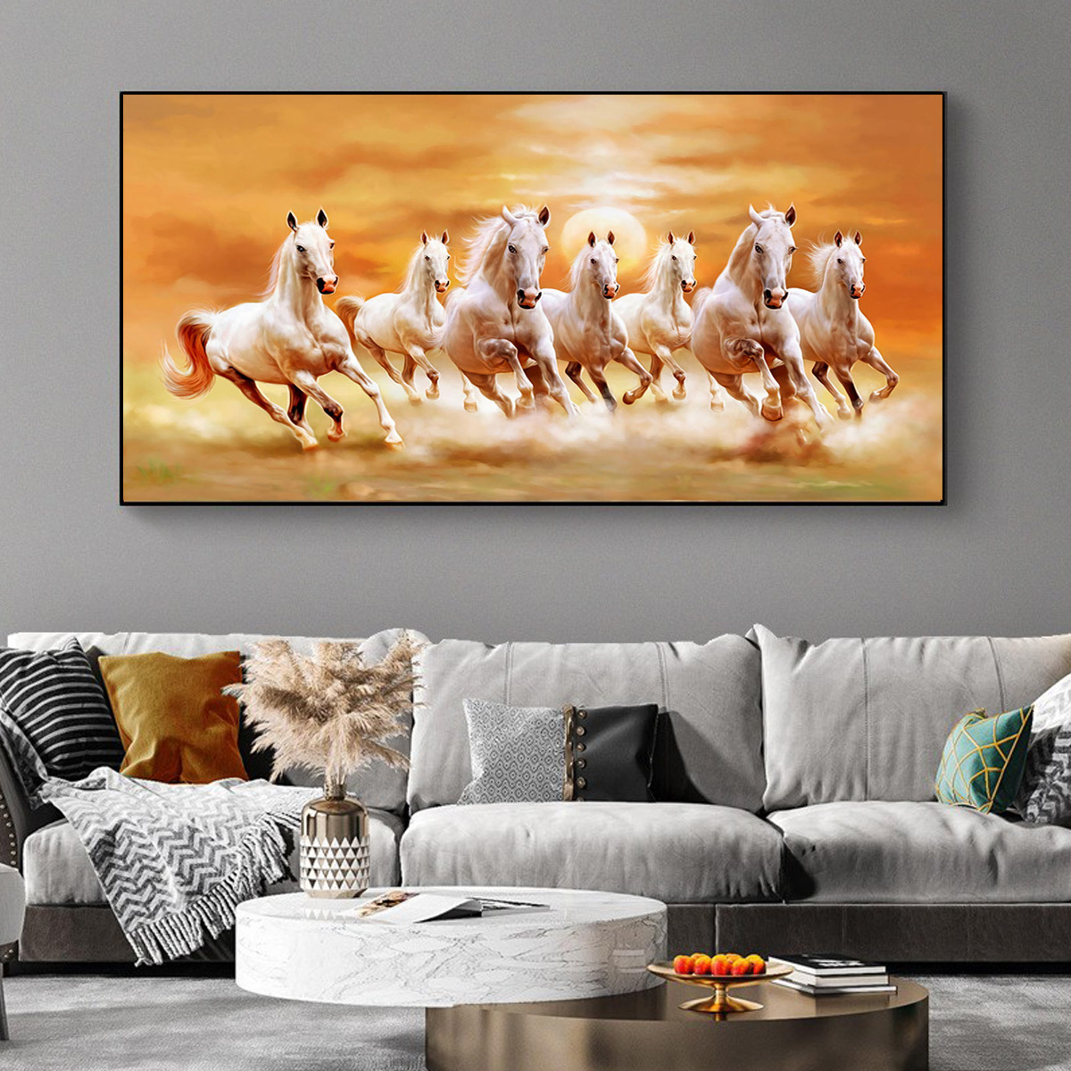 跨境热卖奔驰的七匹马装饰画挂画太阳帆布画壁画挂画客厅卧室装饰
