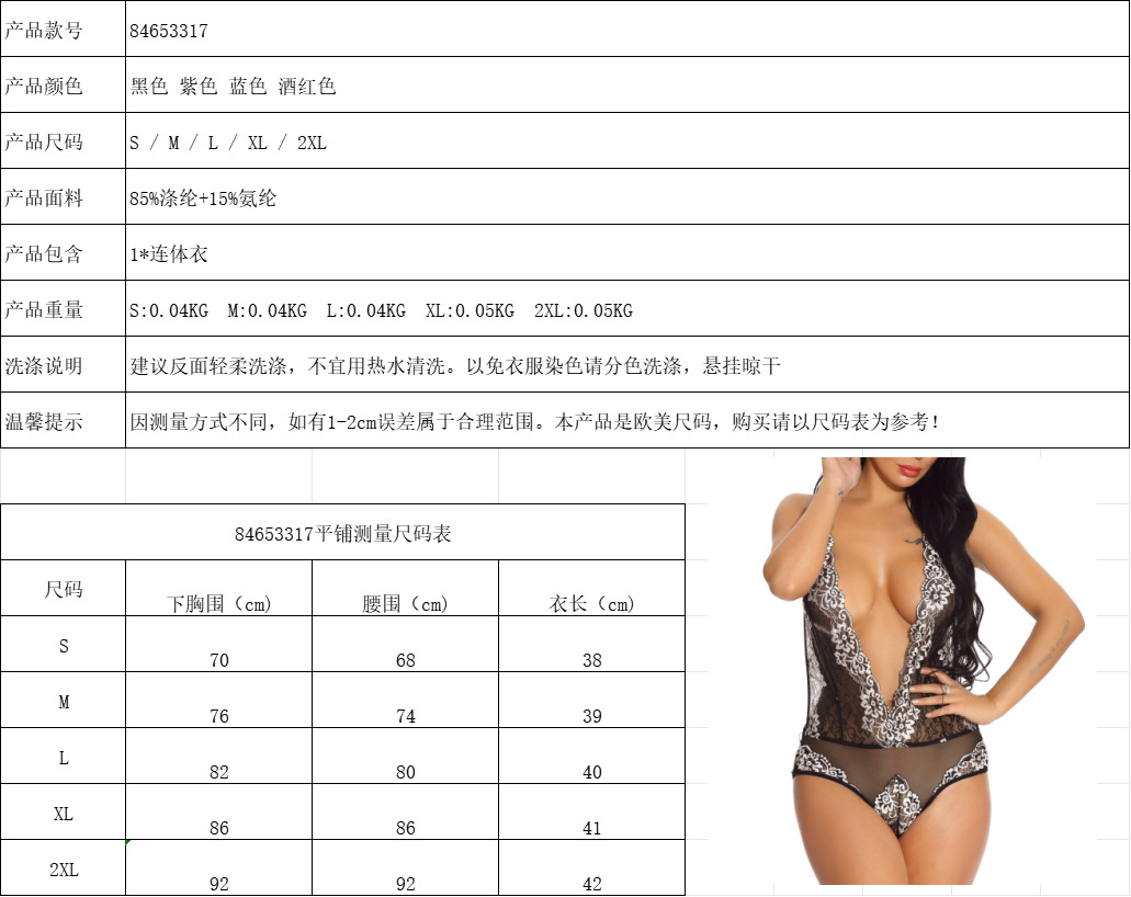 欧米の2023婦人服レースのまつげは胸の前の透かし彫りのセクシーな下着の深いvネックの後ろの帯の連体の服をつなぎます。