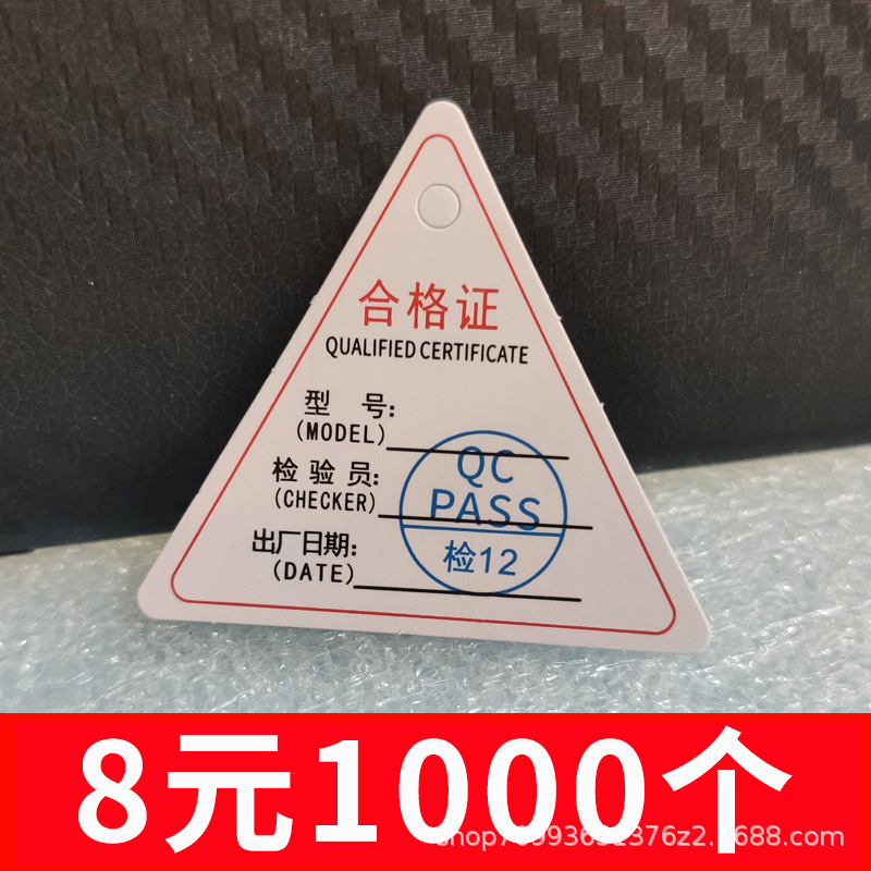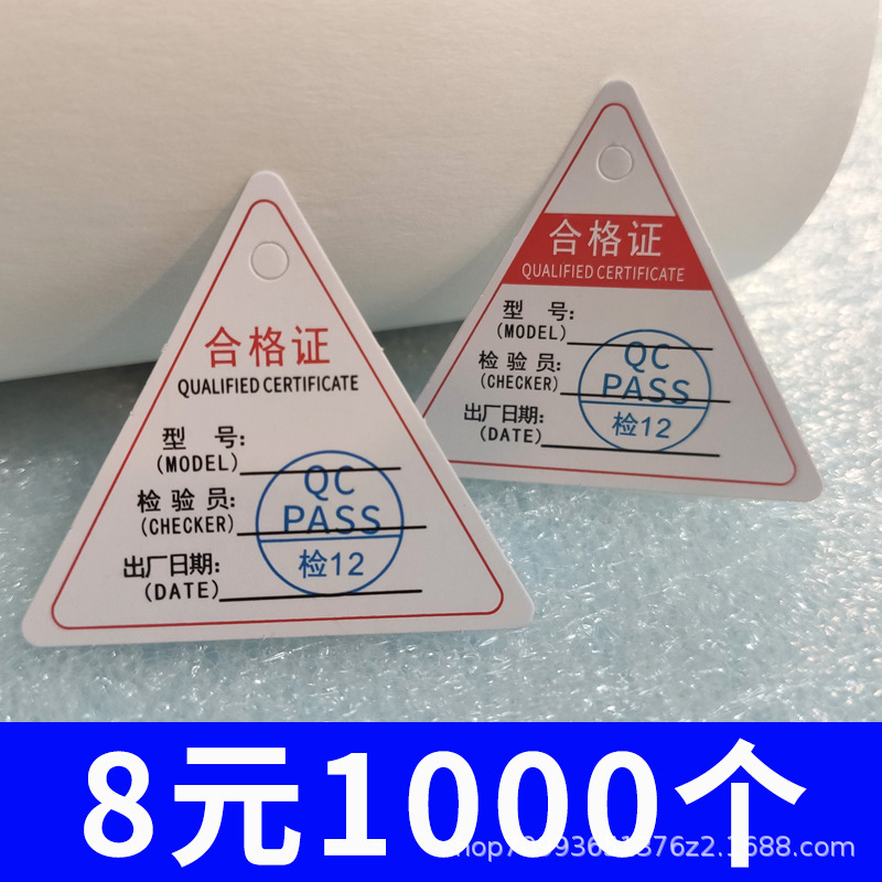 現物通用の三角形の製品の合格証を印刷してつり札の保証カードをしてステッカーのラベルを作ります。