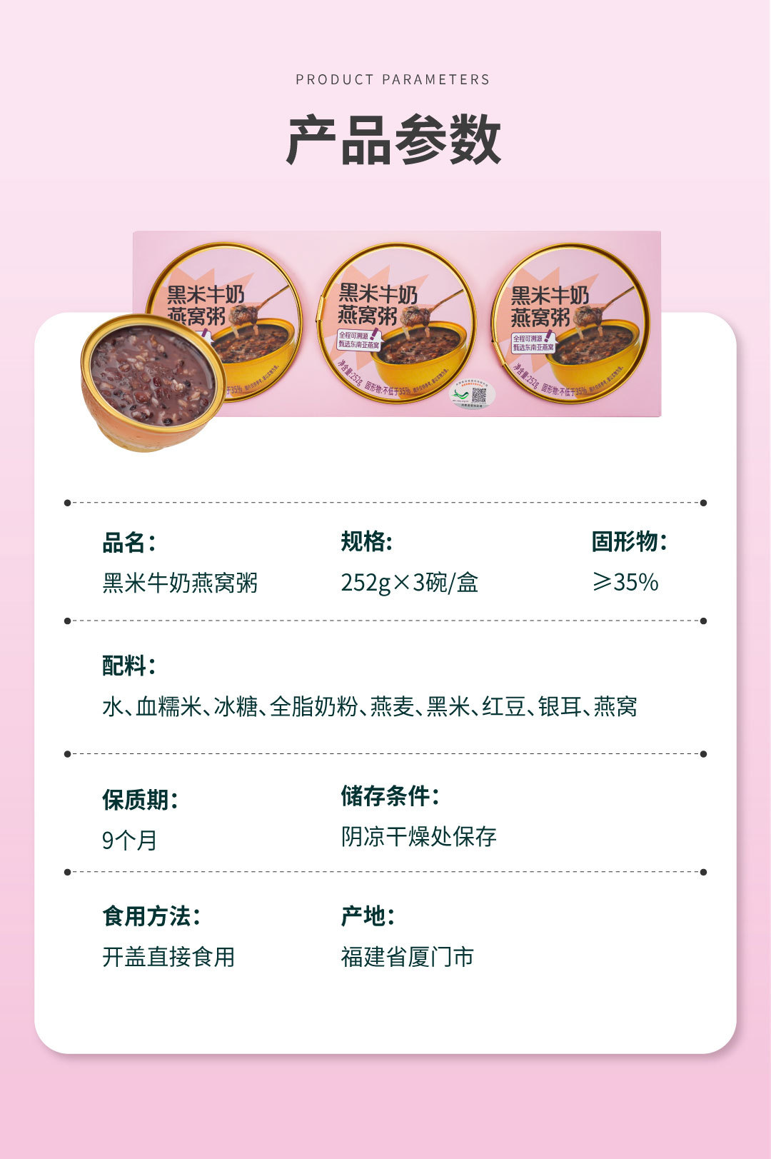 原材料と成分 水、白砂糖、黒米、小豆、オーツ麦、もち米、粉乳、ツバメの巣