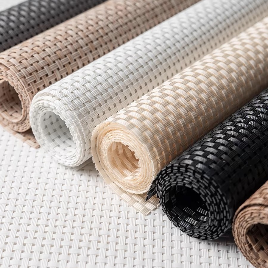 材料组成:70%PVC,30%高强绦纶纱。 生产流程: 1、原生PVC上色 2、已着色PVC包腹高强绦纶纱 3、绕筒整好经线 4、上织机织造 5、修布热定型处理完成网布生产 6、加工车间按照尺寸,栽剪加工,缝合,最后完成各种成品 如沙滩椅、遮阳窗帘、园艺、建筑及农业用的防护围栏、 装饰装潢、餐垫、盘垫、杯垫、桌布、地毯、篷布等。 |