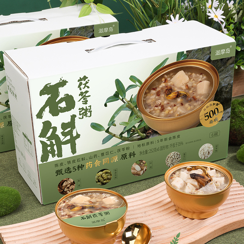 ラベル付きのデンドロビウム・オフィシナール粥、ポリア・チュリヂミ添加のインスタント粥、共同購入用の医薬品規格原料配合