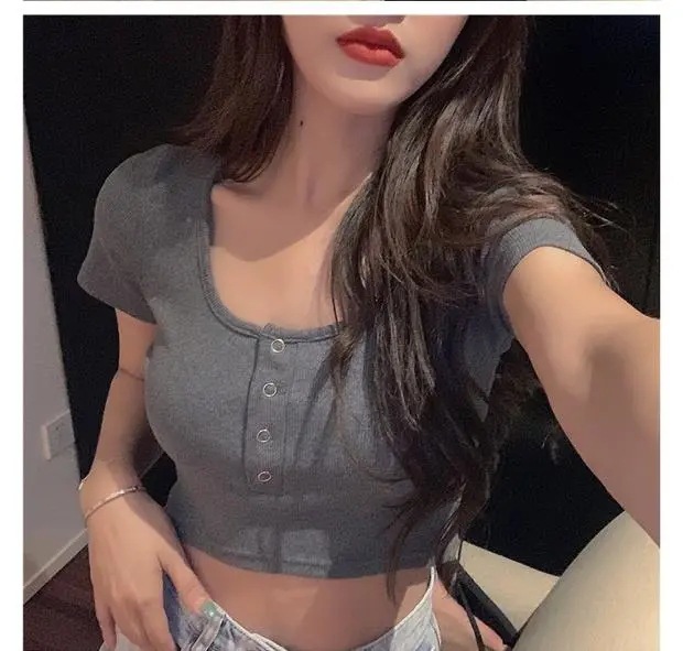 Vネック半袖tシャツ女性2025夏の新型修身がやせているギャルのアメリカ式ハイウエストの短い学生上着のファッション