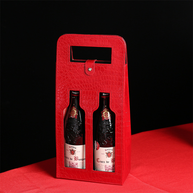 ワインのギフトボックスの皮の箱の二本のワインの包装の贈り物の袋のリストだけの手提げの酒の袋は窓を開けてワインの箱を抜きます。