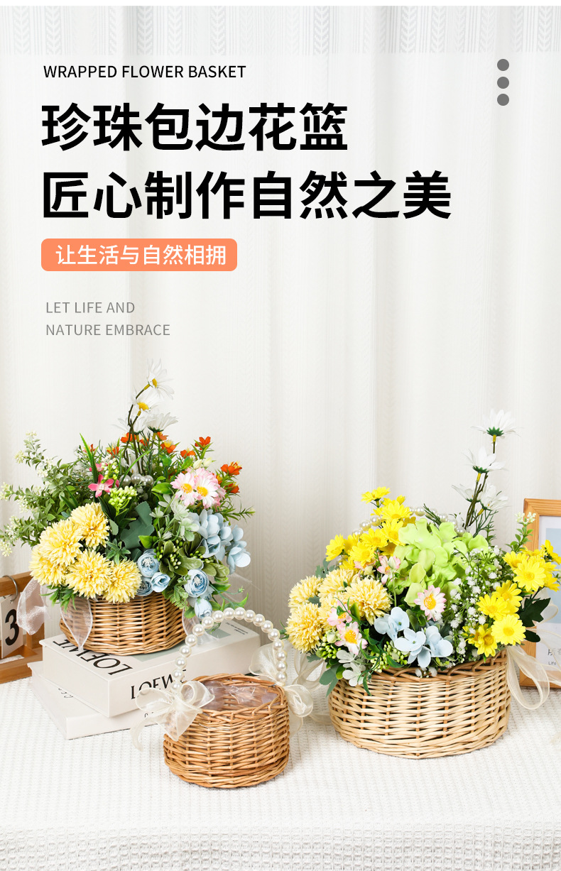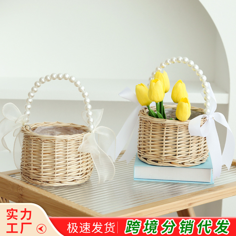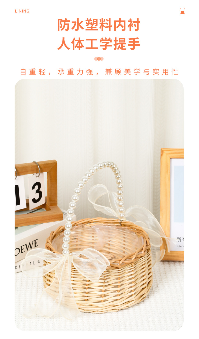 跨境藤编伴手礼手提花篮手工编织珍珠把手收纳篮草编柳编筐花篮子