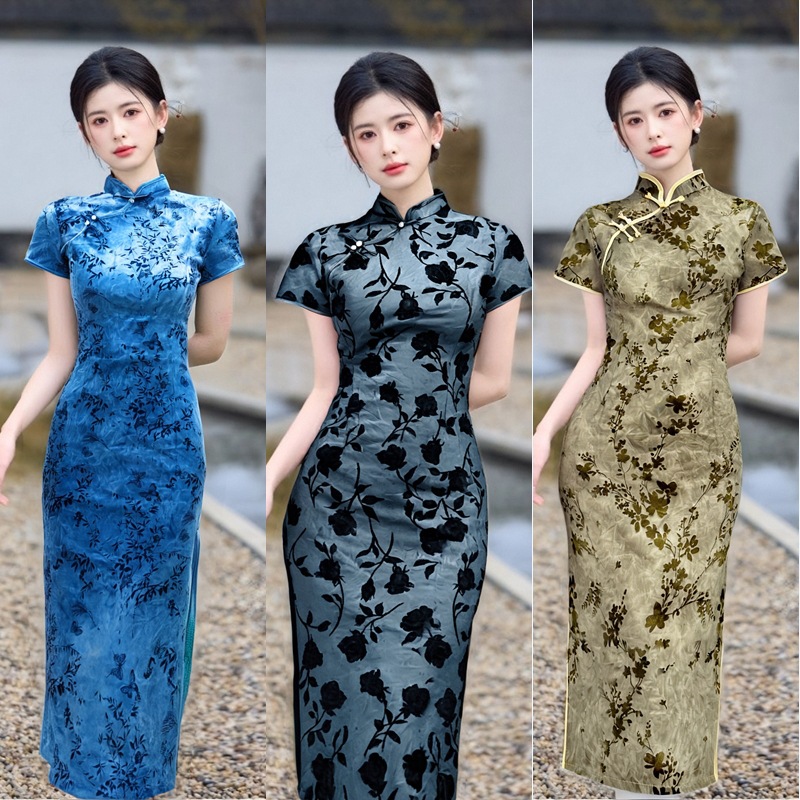 チャイナドレス改良された女性の 2025 春の新作半袖ロングブロケード若い中国風スリムロングスカート卸売