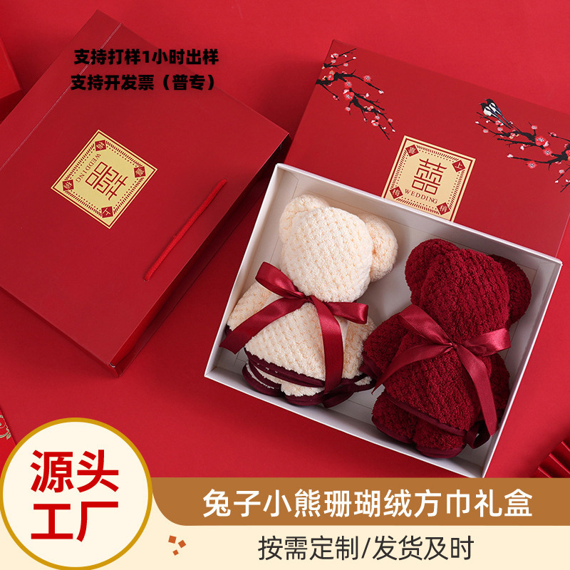 毛巾兔子小熊珊瑚绒方巾婚礼礼盒结婚伴娘礼物礼品批发吸水伴手礼