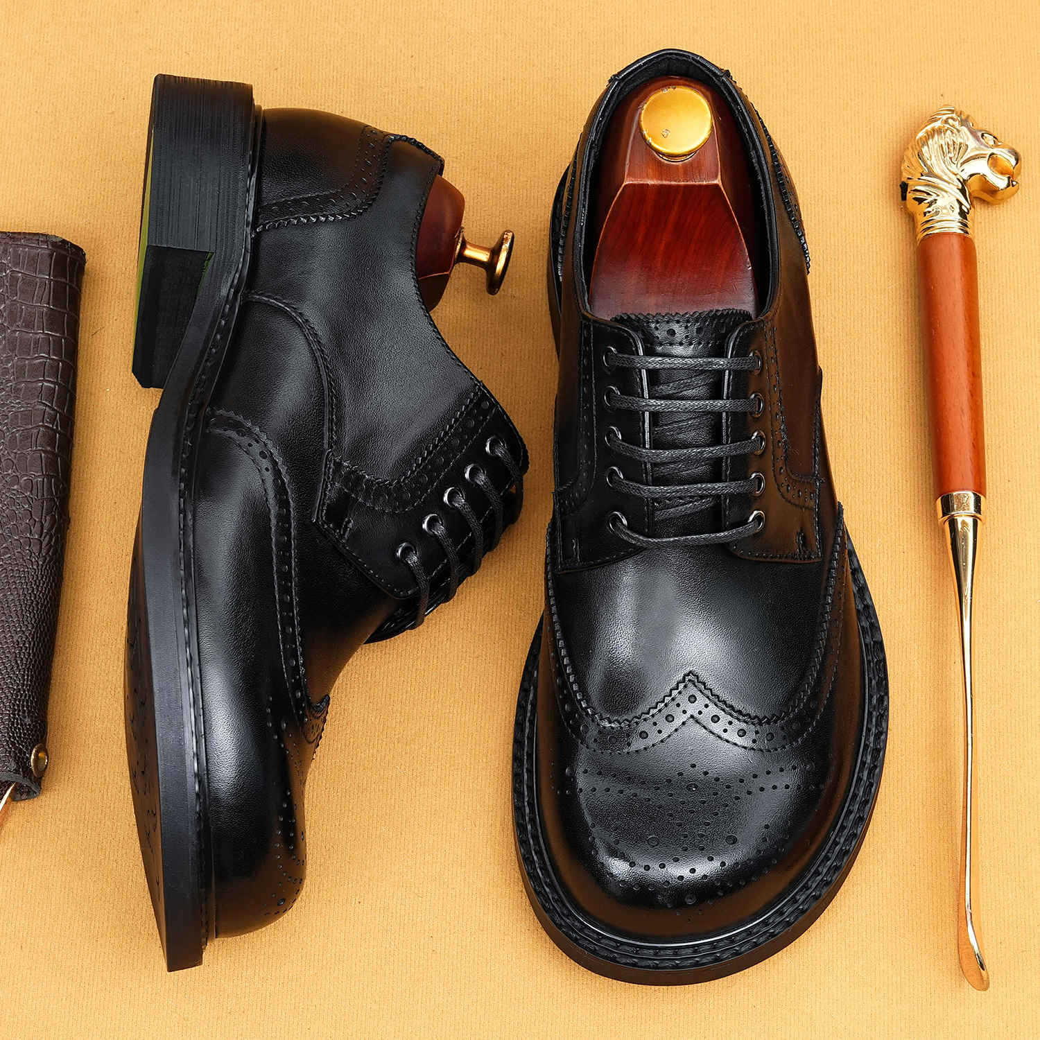 メンズ革靴 春秋 本革 レースアップ 厚底 ブローグ彫刻 一層牛革 ブリティッシュ ビジネスカジュアルシューズ