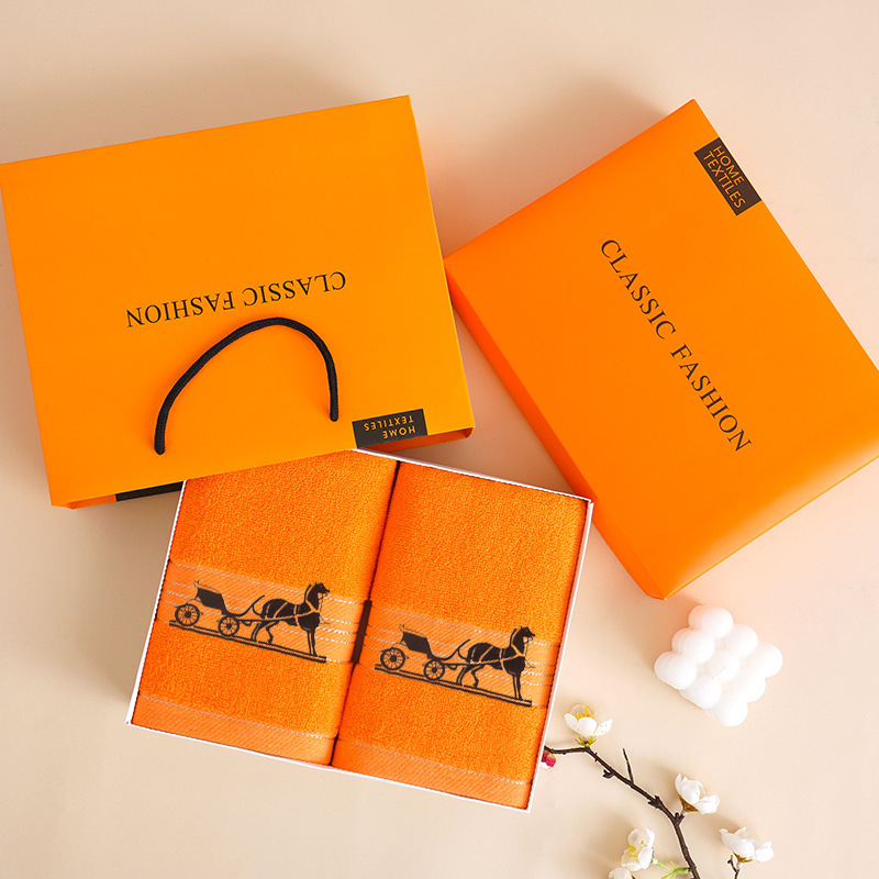 厂家批发珊瑚绒爱马橙毛巾礼盒两条装结婚伴手礼回礼礼品手提盒