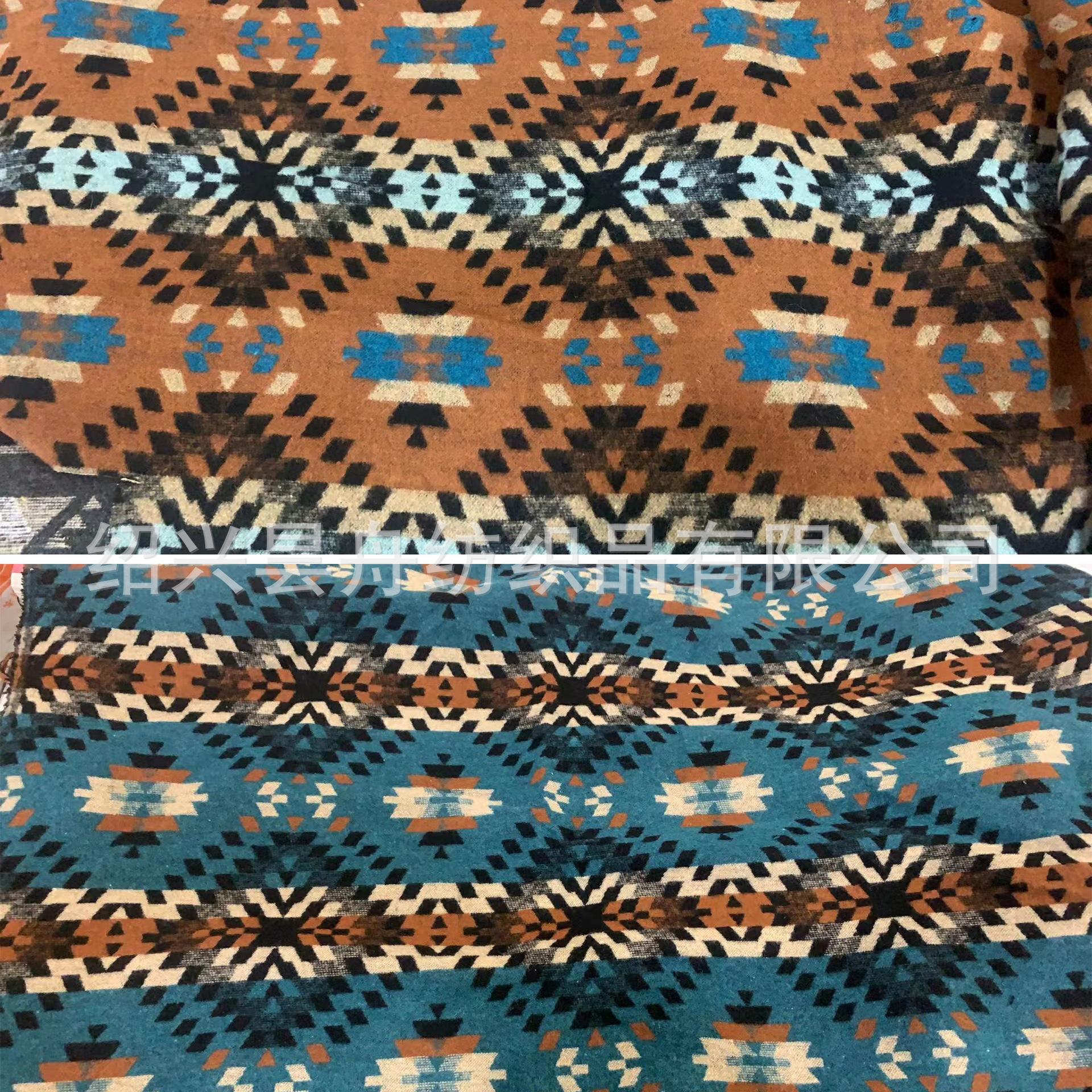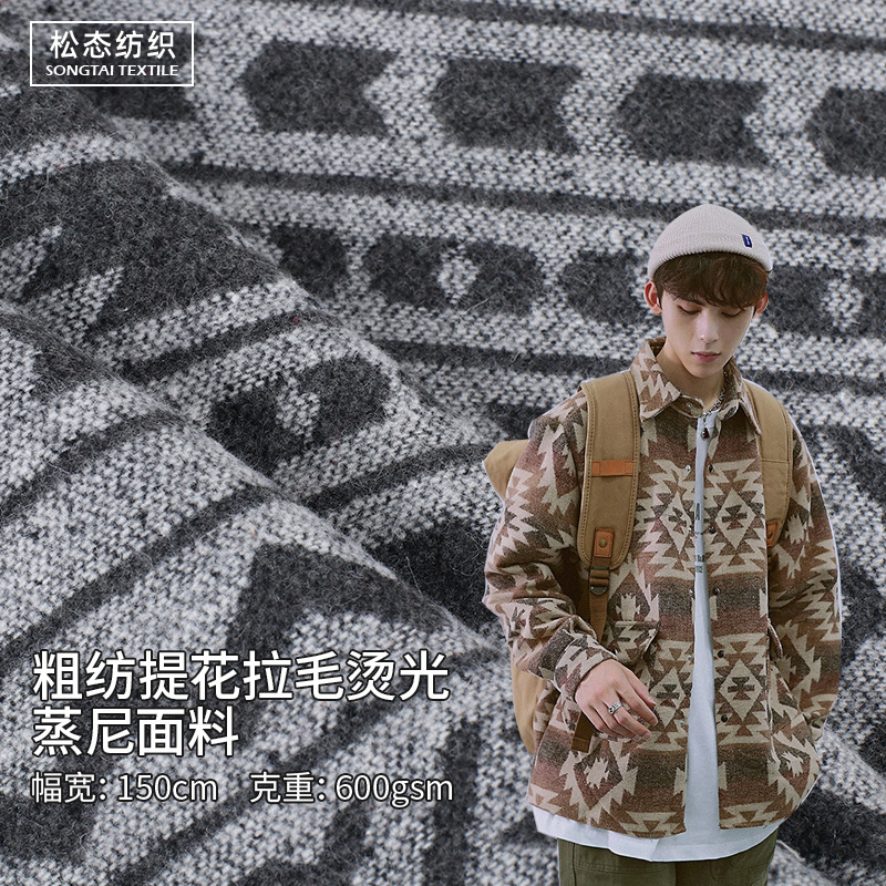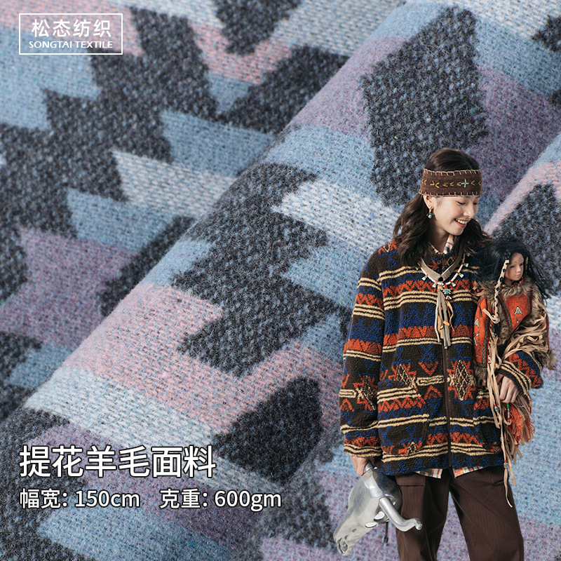 特惠新款羊绒大提花呢绒粗纺面料几何彩色毛呢磨毛大衣外套布料