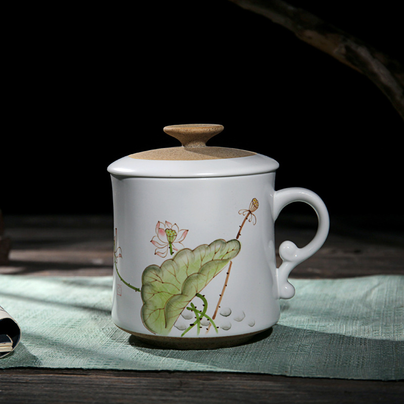 亜光白手描きセラミックオフィスカップ蓋付きフィルター家庭用個人カップ会議ティーカップビジネスイベントプレゼント