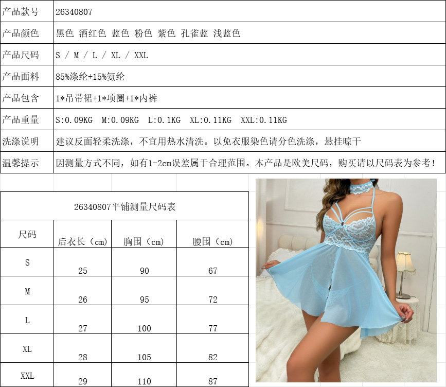ヨーロッパ駅の新商品の婦人服のセクシーな下着のレースの透視セクシーなパジャマの前で襟を開けて首のサスペンダーのスカートの現物を掛けます。