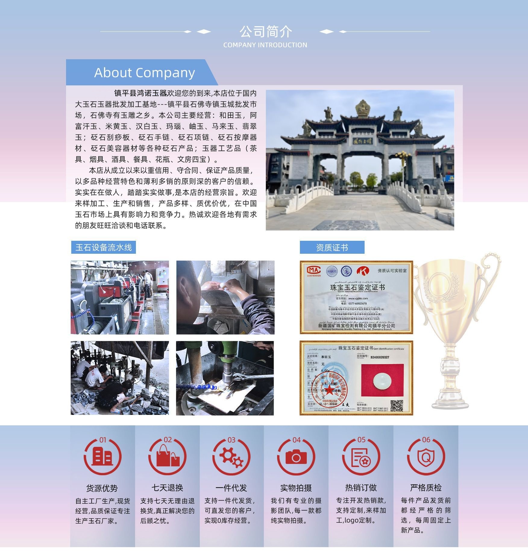 1、多少起批? 满足单个产品低起批量即可起批,不要求金额!!! 2、可以购买2件吗?不满200元可以批发吗? 可以的,只要满足单个产品低起批即可,1件也可以发货 3、如何购买? (1)注册用户 (2) 从左边的分类栏,依次选中看中的-宝贝,放入购物车 。 (3)提交订单,选择支付方式并付款 (4) 确认货款后发货。 4、如何运输? 我们发货,都用快递发送,可以直接送上门,足不出户,享受便捷的快乐采购,不用再为货源四处奔波了。较量的货品为了给您节省运费我们支与您沟通发物流,物流需要自提。我们快递申通、EMS经济快递,这两个快递不到的地方,可以发EMS标准件。 5、付款方式? ①支付宝付款:先把款付给支付宝,收到货后,点击确认收货,如果收到货不满意,可以选择退款、退货。安全、方便。 ②网银付款:办理了网上银行的,可以直接从网上汇款给我们,然后通知客服人员,我们收到款后,会于当天或第二天把货物发出。 ③银行汇款:银行汇款后通知我们发货。 ④货到付款:我们货到付款只跟德邦快递合作,就是德邦能到的地方,才可以用货到付款,货到付款不包邮,并且收取货款总额的5%手续费,这个手续费是德邦快递收取的。 6、售后如何? (1)运输损坏赔偿:在运输过程中,如果出现货物损坏或丢失等情况,我们将全额赔偿客户的损失。 (2)收到货品如果不满意,或产品有问题,从收到货那天算起三天之内可以进行退换货,如超过三天就默认您对产品无异议,不再进行退换货。 7、(除砭石产品,包装盒外)其他商品有什么优惠政策? ① 一次性在本店购物满1000元,产品可享受包邮。 ② 再本店购物满两次以上,均送小礼品。 ③ 本店持有积分业务;100元积1分 ,积分可抵货款。 累计批发达5万元的顾客,除享受以上优惠外还可长期享受9.9折优惠! 8、产品都是吗?有没有证书? 我公司所有产品均质量高, 和田玉,翡翠及其他玉石都可以出证书,每个产品具有单独的证书编号,上网可查询检测结果,如果需要证书,需向客服人员说明,每款加收检测费。 9、产品是如何包装的,有带礼品盒吗?吊坠都有配绳子吗? 由于我公司产品批发价大幅下调,现有的产品都不带礼品盒,吊坠不配送玉绳或线绳,有需要礼品盒的客户,可以到包装区选购自己合适的包装和挂绳。我们每个产品都带有硬质塑料袋或者泡膜,确保运输的安全。
