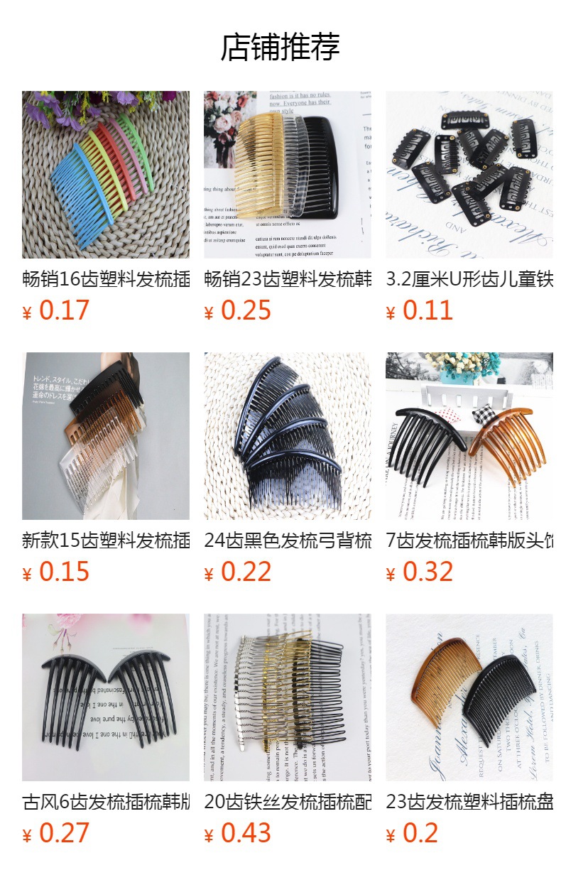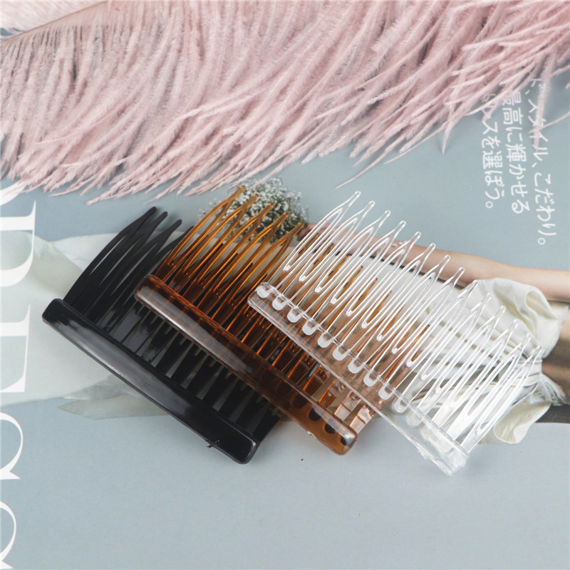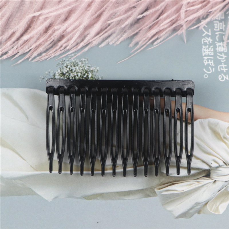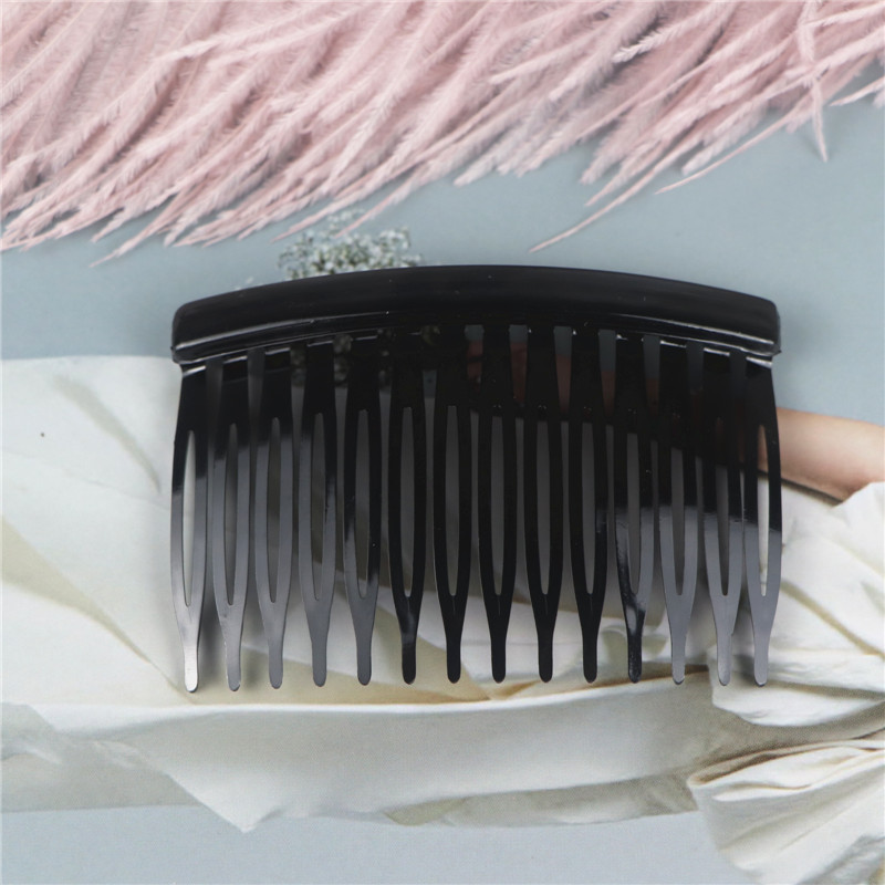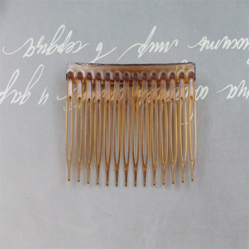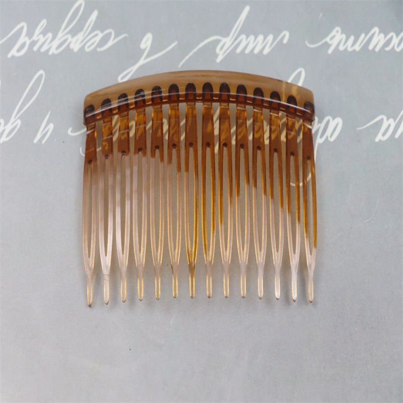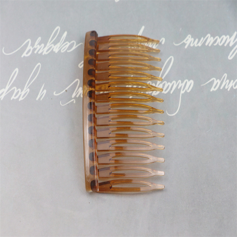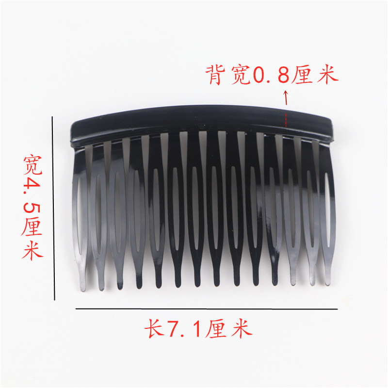 14齿发梳,插梳。长度是7.1厘米,宽度是4.5厘米,重4.1克,背宽0.8厘米,厚0.7厘米,现货是3个颜色,其他颜色可以定做,主要是在上面镶钻,镶珍珠或者粘大的布艺蝴蝶接配件,款式多,有7和11和14和23和29齿。