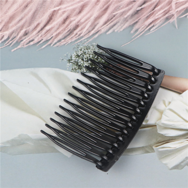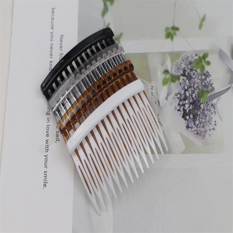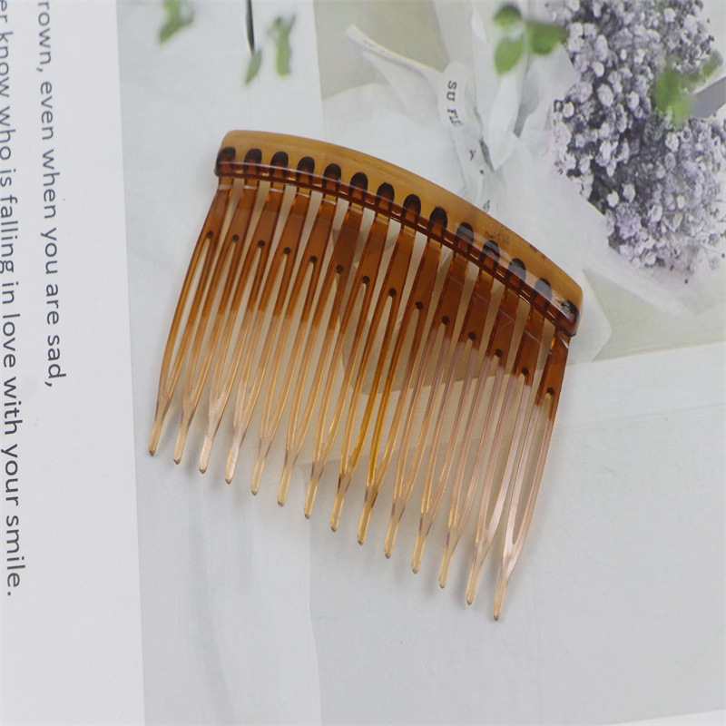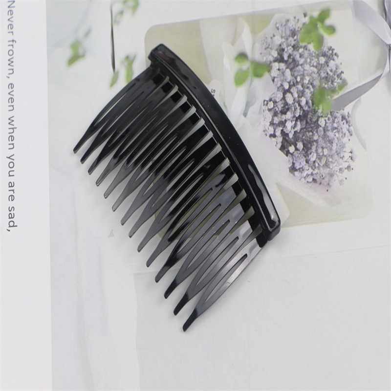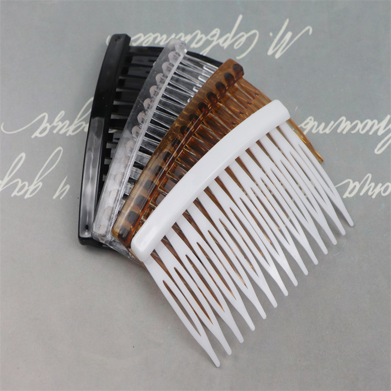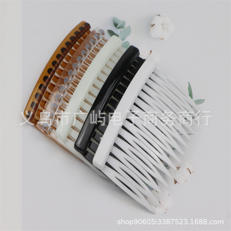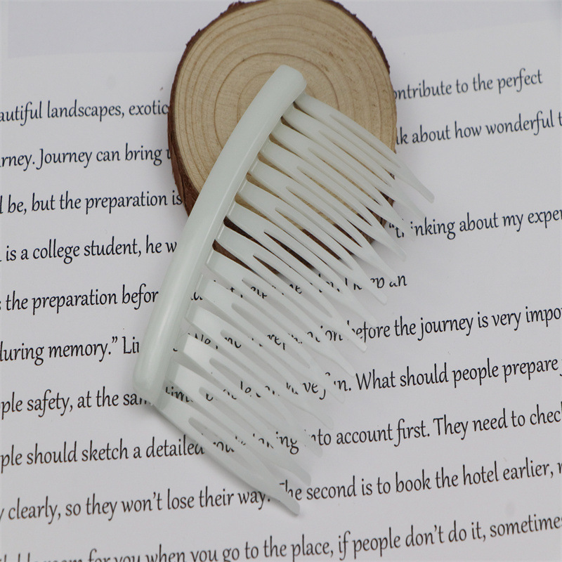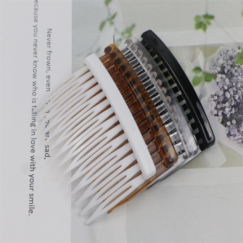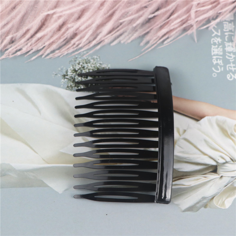 14齿发梳,插梳。长度是7.1厘米,宽度是4.5厘米,重4.1克,背宽0.8厘米,厚0.7厘米,现货是3个颜色,其他颜色可以定做,主要是在上面镶钻,镶珍珠或者粘大的布艺蝴蝶接配件,款式多,有7和11和14和23和29齿。