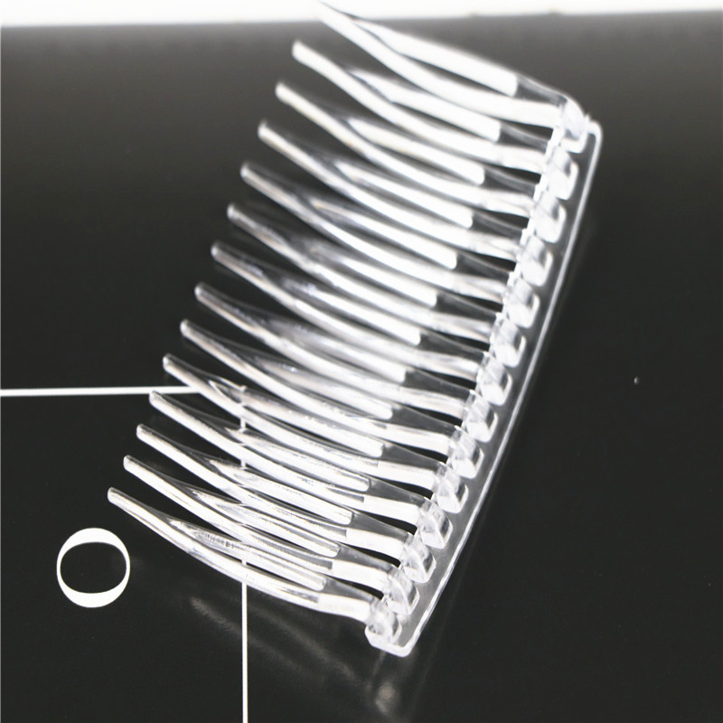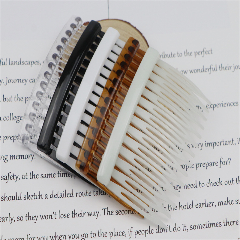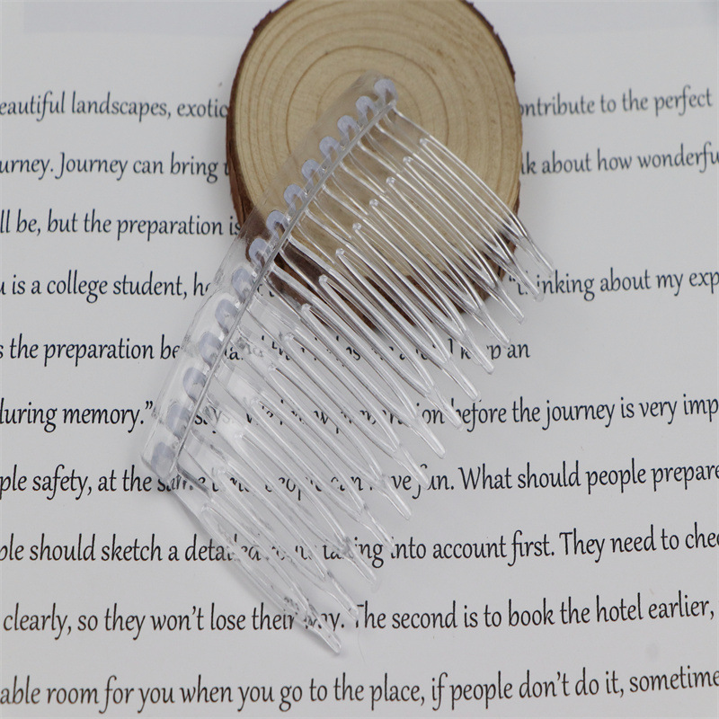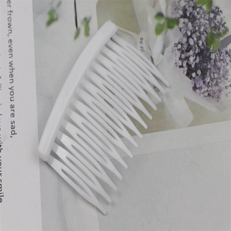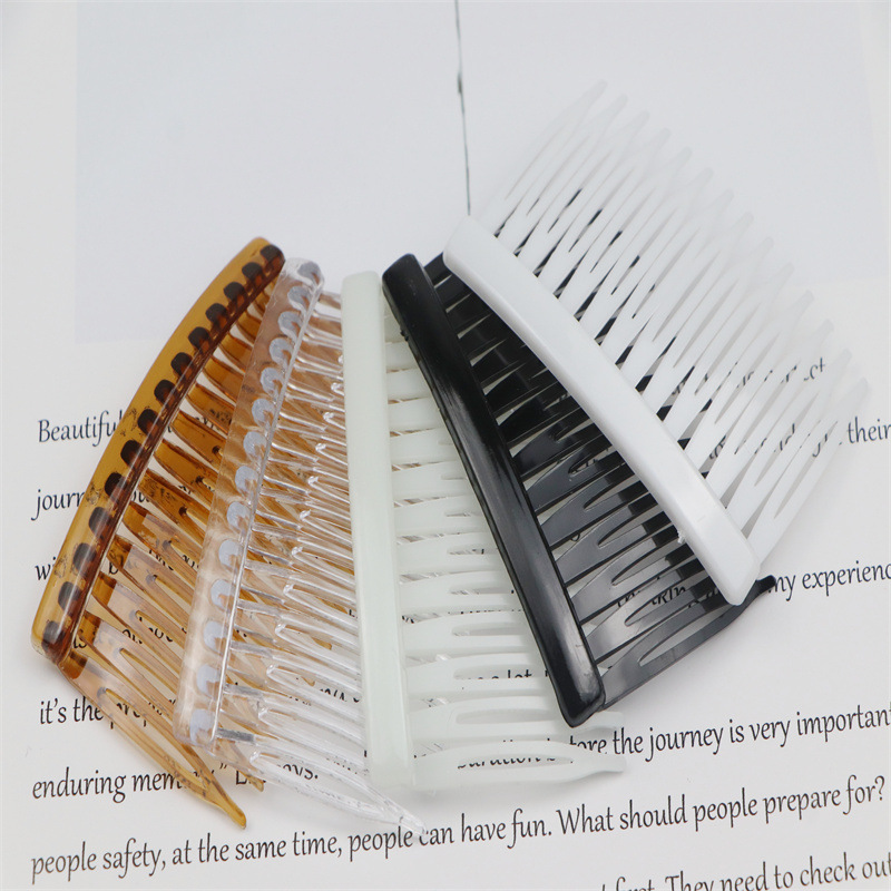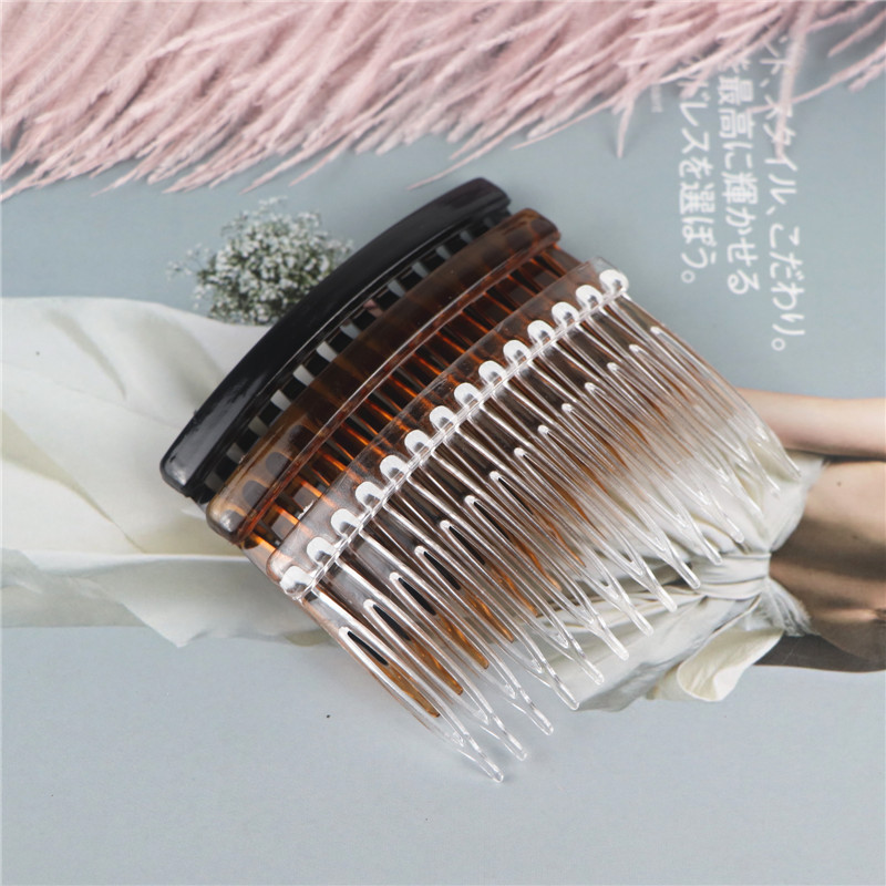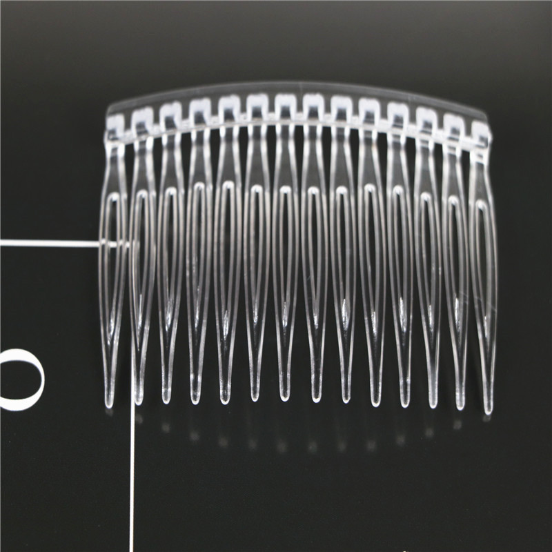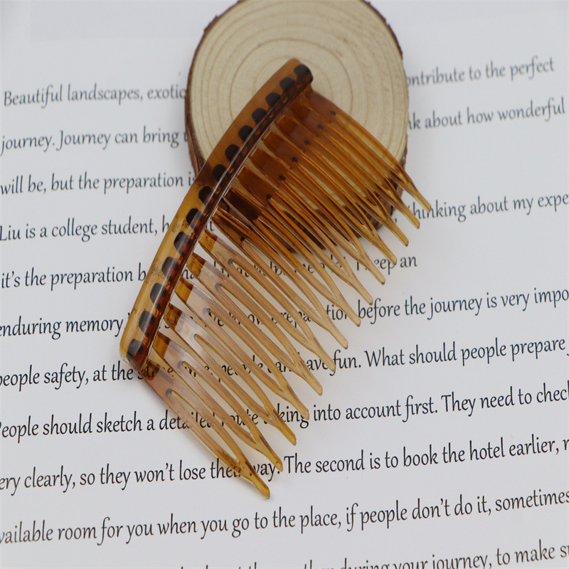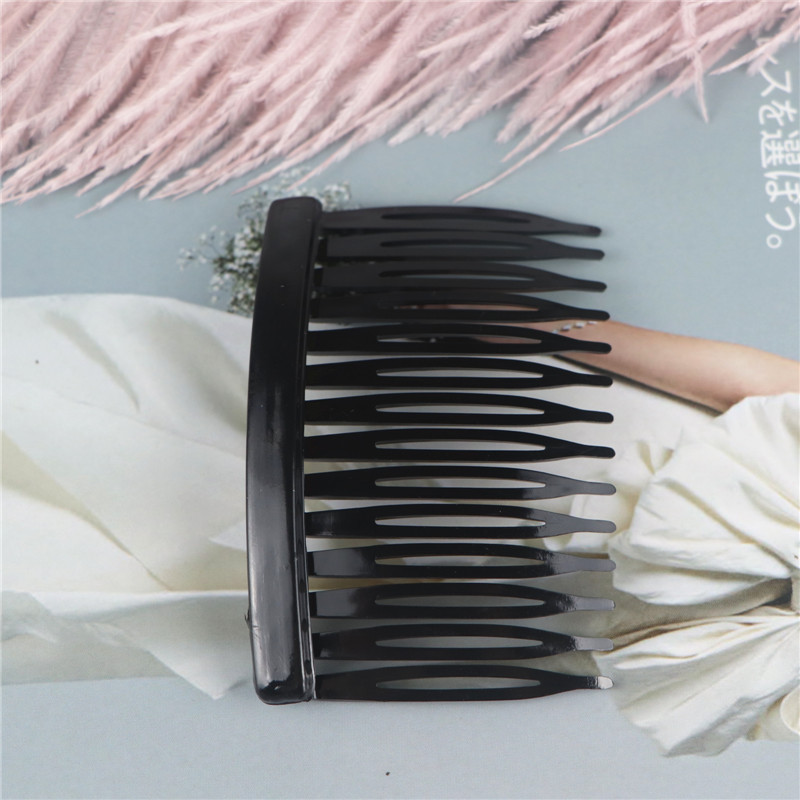 14齿发梳,插梳。长度是7.1厘米,宽度是4.5厘米,重4.1克,背宽0.8厘米,厚0.7厘米,现货是3个颜色,其他颜色可以定做,主要是在上面镶钻,镶珍珠或者粘大的布艺蝴蝶接配件,款式多,有7和11和14和23和29齿。