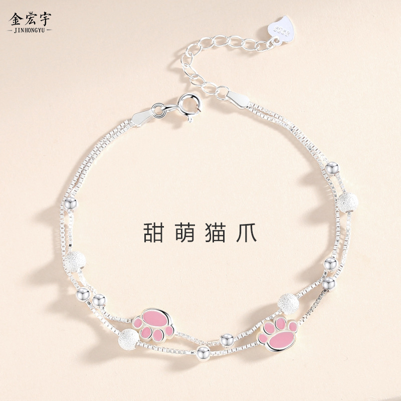 S925純銀ピンク猫爪ブレスレット女性小清新森系二重箱チェーン少女心丸珠手飾りプレゼント