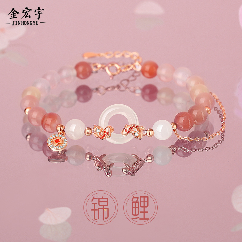原创锦鲤盐源玛瑙手链女纯银复古新中式和田玉平安扣串珠手串礼物