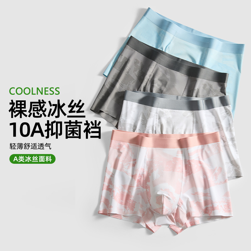 新品冰丝无痕男士内裤中腰四角平角裤10A级抗菌透气轻薄印花网孔