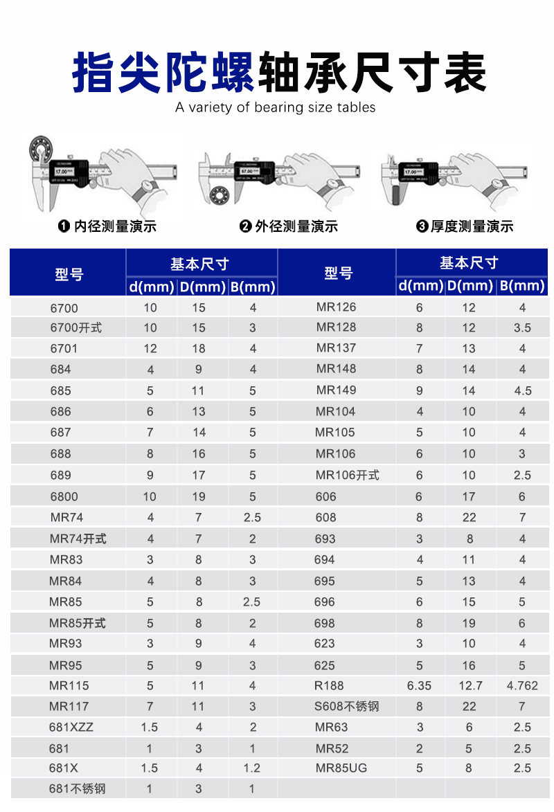 型番 695(ブルーケージ)5*13*4,695(ブラウンケージ)5*13*4,MR83 ジャイロベアリング 3*8*3,693 ジャイロベアリング 3*8*4,R188 ジャイロベアリング 6.35*12.7*4.762,625 ジャイロベアリング 5*16*5