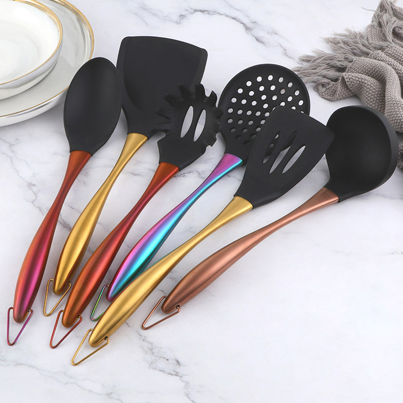 304メーカー現物シリコン調理器具調理シャベルスプーンセットチタンメッキ金ステンレス柄シリコンシャベル調理器具卸売り
