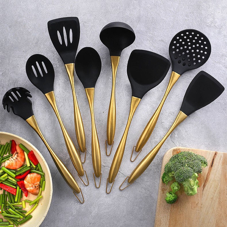 304ステンレスシリコン調理器具8点セット調理シャベルスプーンセットチタンメッキ金ステンレス柄シリコンシャベル調理器具