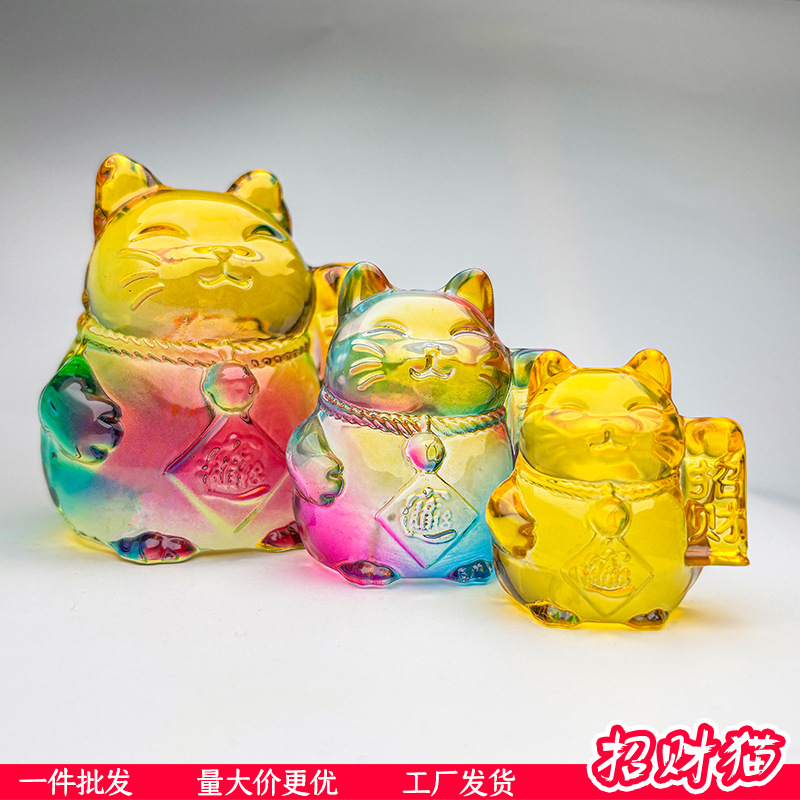 ガラス製招き猫置物、フィギュア、開店祝い、レジカウンター飾り、家の装飾、イエロークリスタル招き猫