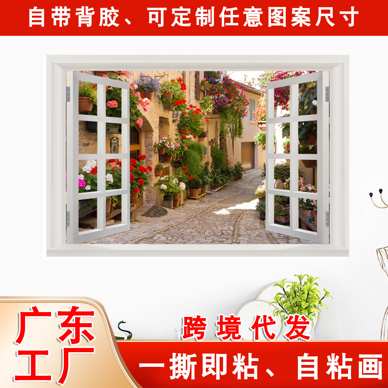 広東工場製 模擬窓風景画 ソファ背景用粘着ウォールステッカー 防水自己粘着リビング装飾画