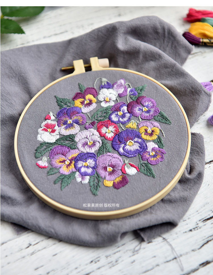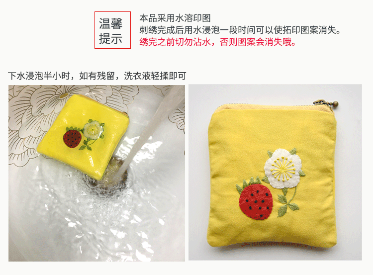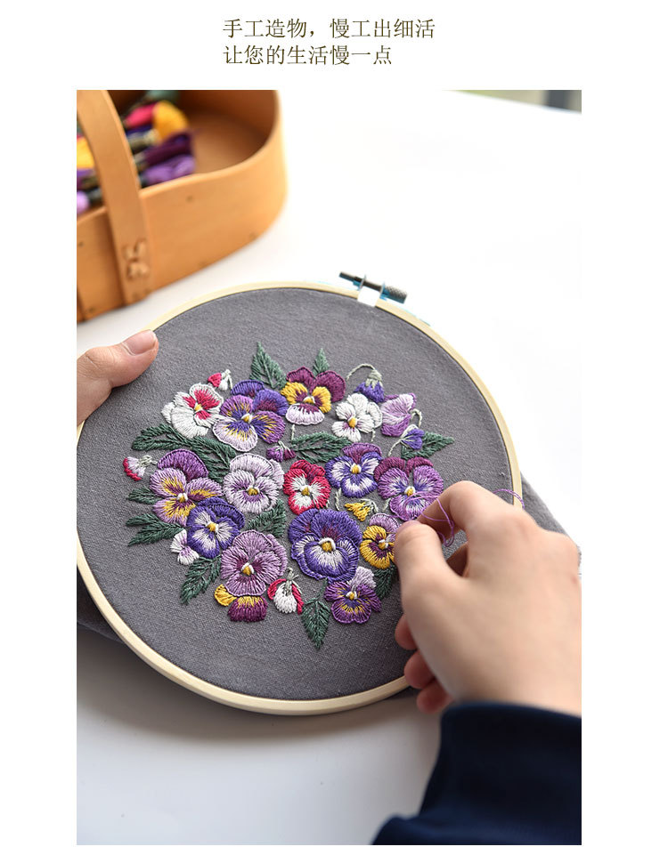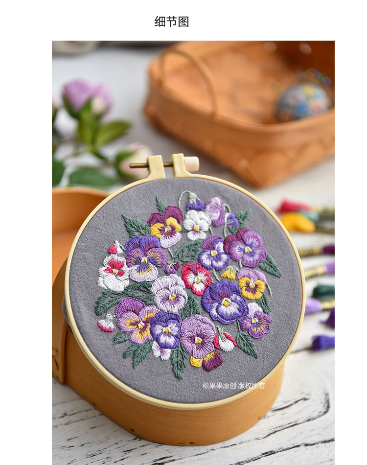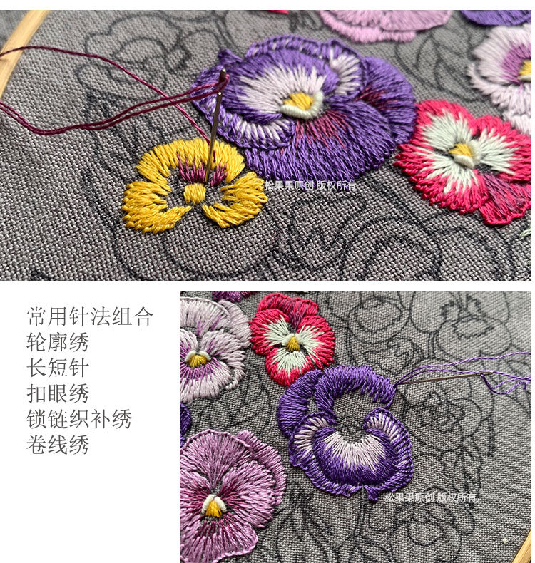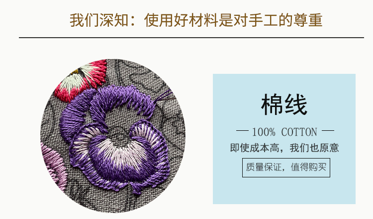 基础材料包内容:印图绣布(图案可水溶)、绣花针、绣花线(棉)、图纸教程、选配15或是18CM绣绷
