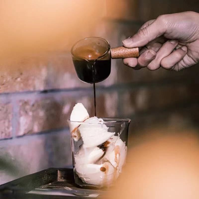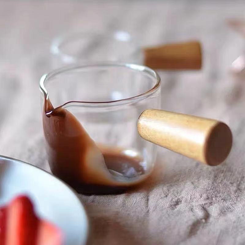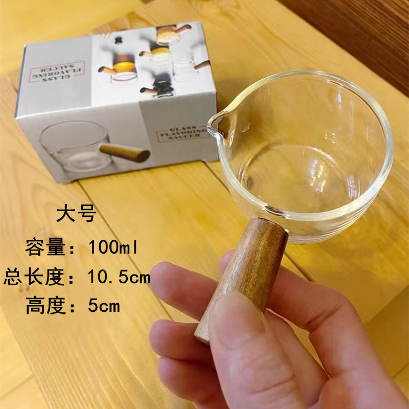 Insガラスのミルクポットの小さいミルクの杯の木の柄のミルクの缶のミルクの杯のディップの調味料の小皿のステーキの洋食の汁の斗