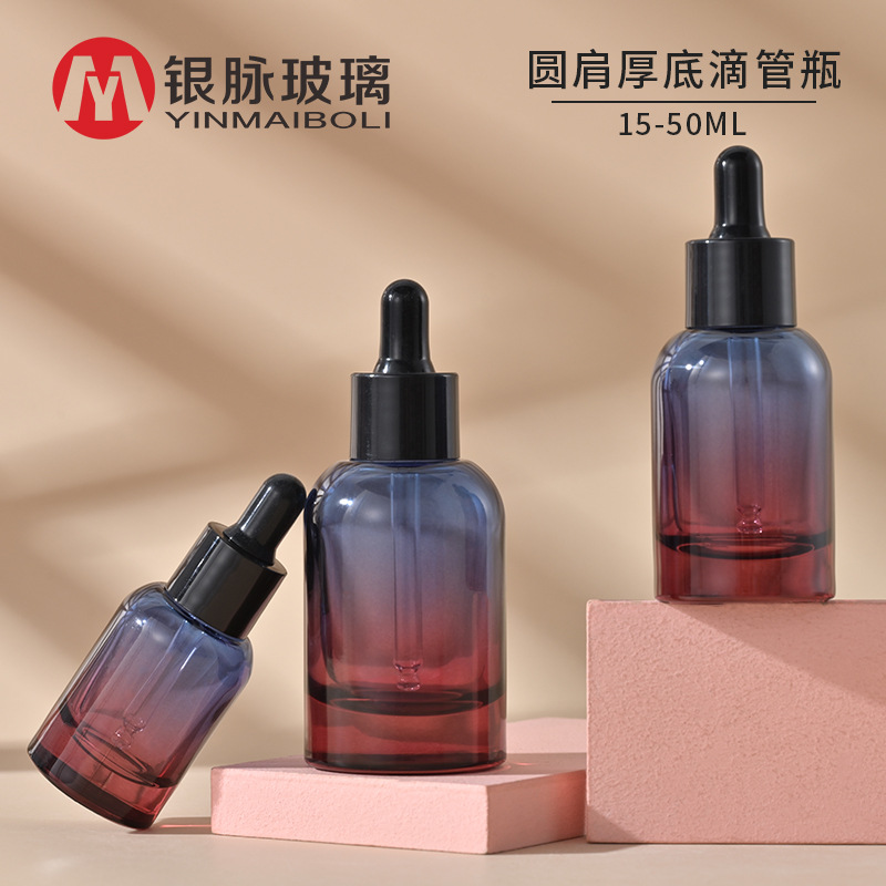 銀脈15-50ml丸い肩の厚い底のスポイトの瓶の青い赤いグラデーションの精華の原液は瓶のガラスの精油の瓶を分けます。