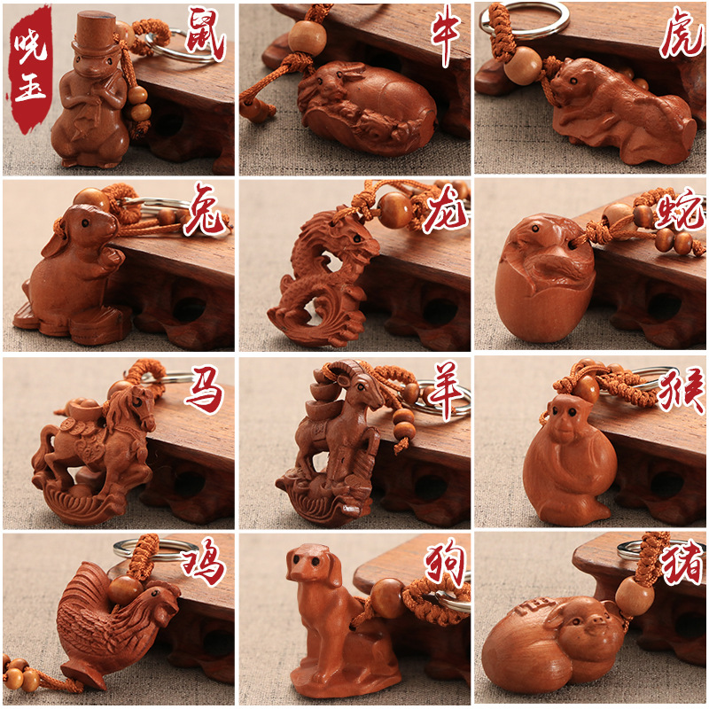 桃木立体十二生肖キーホルダー保平安自動車キーホルダーペンダント露店手作り彫刻