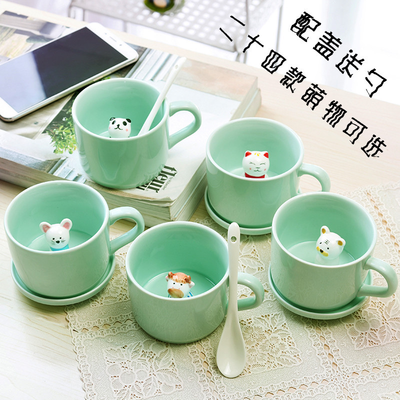 メーカー卸売り創意手描きカップ陶磁器カップマグカップかわいいカップ家庭用蓋付きスプーン青磁動物カップ