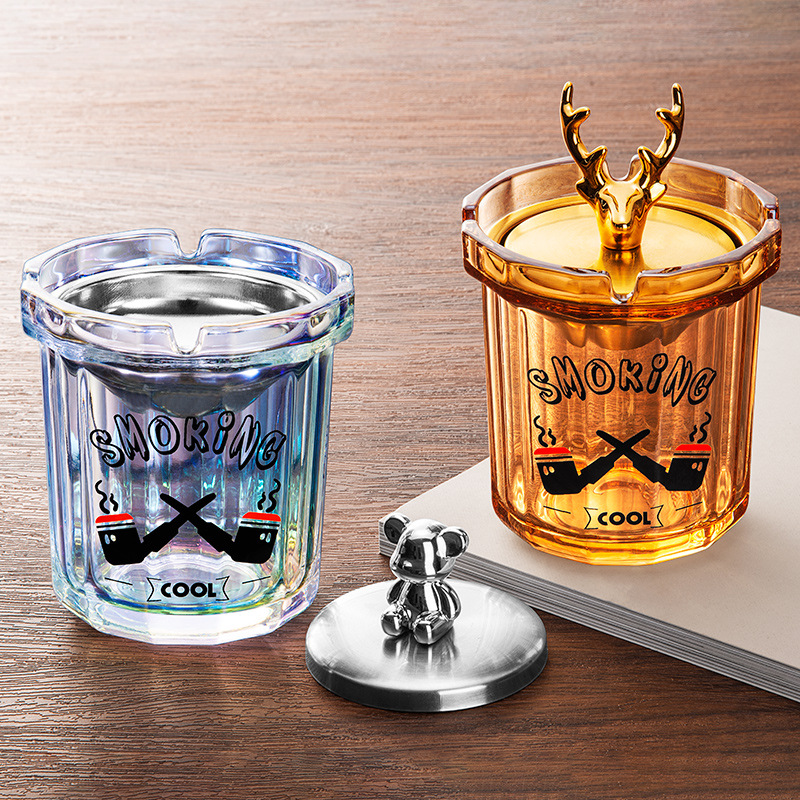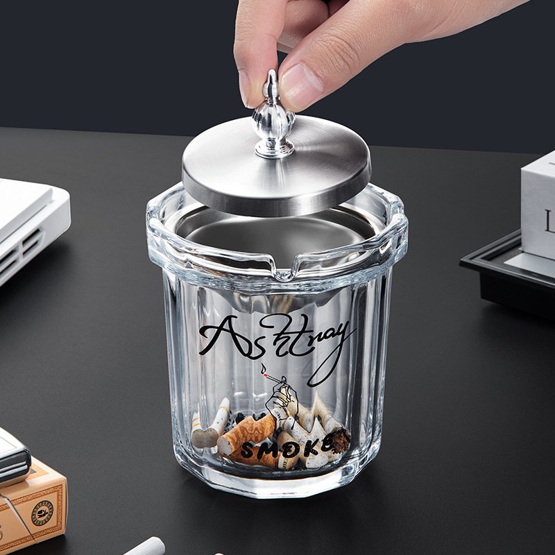 創意灰皿家庭用厚手ガラスステンレス蓋飛灰防止蓋付きオフィス灰皿個性防風