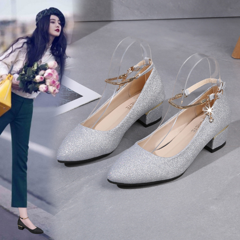 2025年春向け、粗ヒールのレディースシューズ、ウェディングシューズ、ポインテッドトゥ、ミドルヒール、オフィスシューズ、浅口、ワンストラップ、シングルシューズ、卸売、メリージェーンシューズ