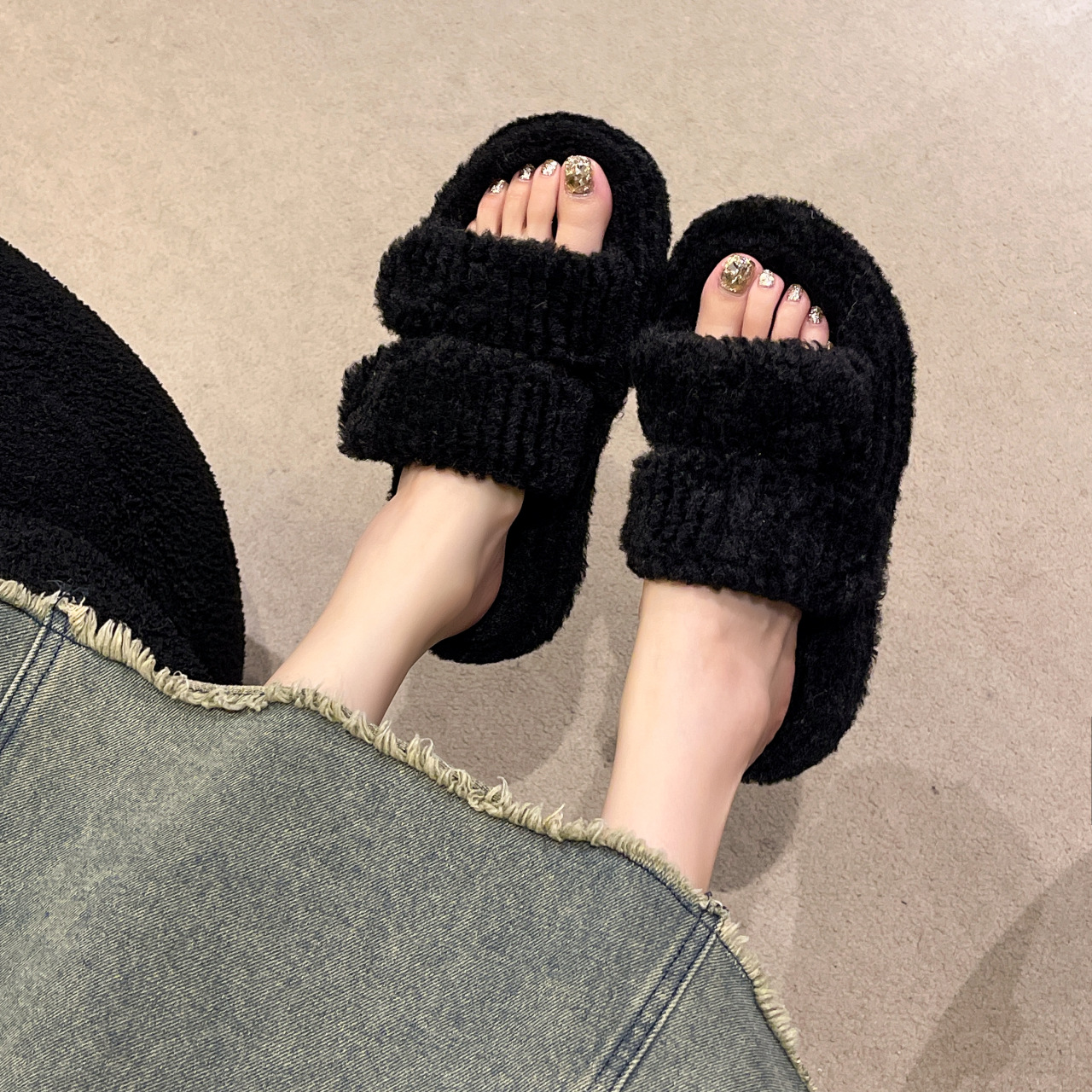 ベルベットの松餅の厚い底が高くなって、毛が二本の女性の外にファッションを着て、大きなサイズの毛がふわふわしているスリッパ卸売りをしています