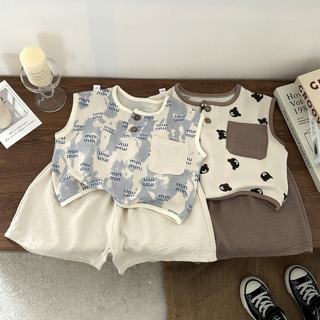 2025 新しい子供の夏薄いノースリーブベストショーツスーツ男の子と女の子のためのルーズファッションカジュアル西洋スタイル花柄