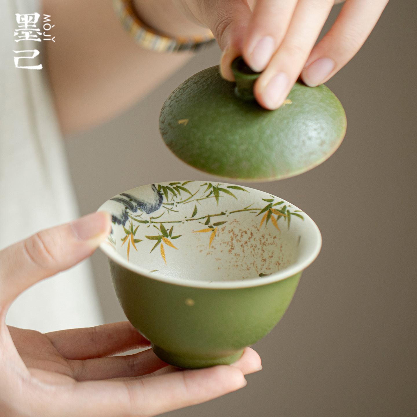 墨己小青柑手绘金竹仿古陶瓷盖碗功夫茶具家用泡茶碗文人竹子盖碗