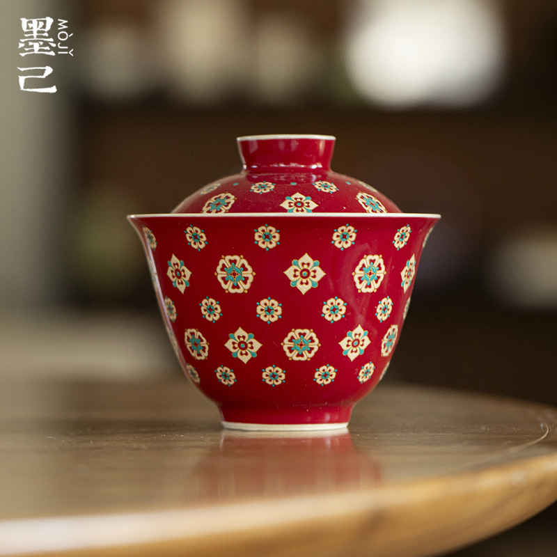 墨己郎紅琵琶紋老花要素陶磁器蓋碗工夫茶器家庭用赤色祝い国風蓋碗